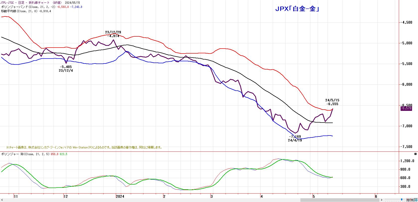 2024/05/15 「JPX白金ーJPX金」の鞘(チャート分析) (JPX白金ーJPX金)の鞘は、2024年に入ってからは「金買い・白金売り」が長らくバンドウォークで続いていたが、日本のGW中に中心線を上抜き、「金売り・白金買い」に途転した。先週末にザラ場で割り込んだものの、終値ベースでは中心線を維持。 +2σ接近も、バンドは収れんしており、%bのクロスを伴って上放れると、順張り型のバンドウォークが開始する可能性も。 「チャートワンポイント」カテゴリの最新記事 < 前の記事次の記事 >