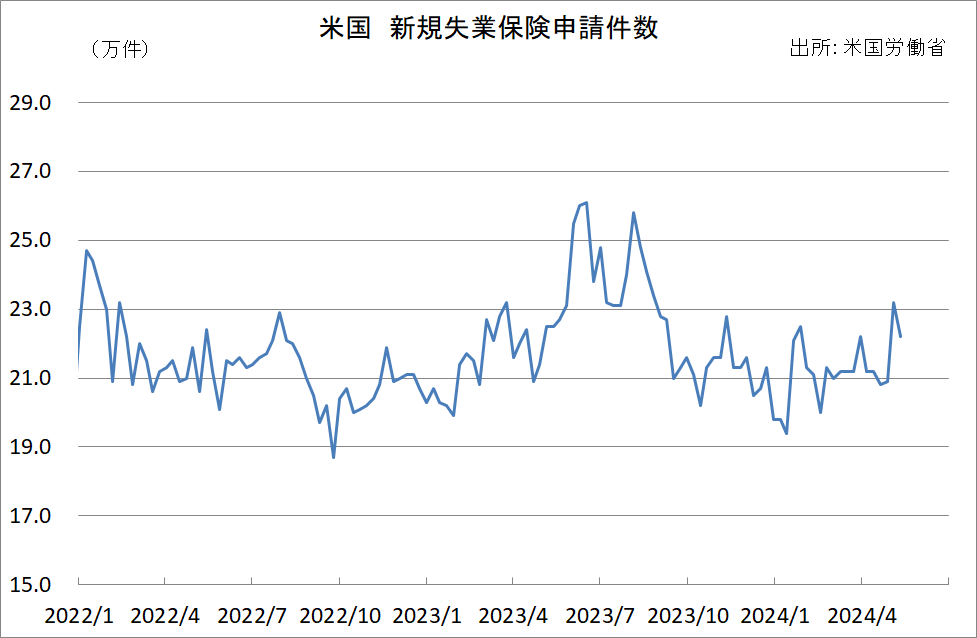 2024/05/17 新規失業保険申請件数 米労働省が16日に発表した5月11日までの1週間の新規失業保険申請件数(季節調整済み)は前週比1万件減の22万2000件となった。 市場予想は22万件だった。前週の増加から一転して減少に転じ、労働市場の底堅さが改めて浮き彫りになった。 5月4日までの1週間の継続受給件数は1万3000件増加し、179万4000件となった。 「旗は鳴る鳴る ラッパは響く」カテゴリの最新記事 < 前の記事次の記事 >