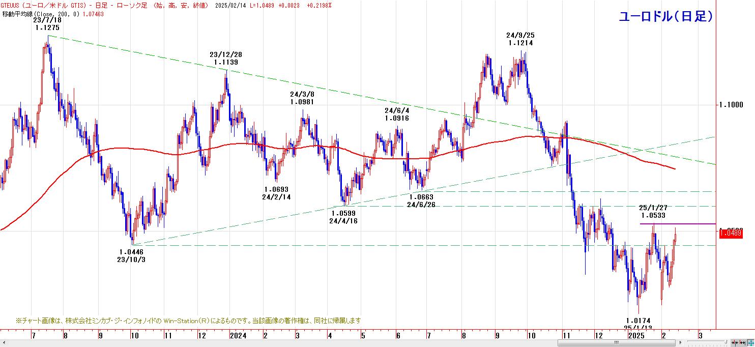 ユーロは対ドルで4日続伸し、前日比0.0025ドルのユーロ高・ドル安の1ユーロ=1.0485〜95ドルで終えた。米経済指標を受けた米長期金利の低下に加え、ロシアとウクライナの停戦交渉が進むとの見方がユーロを支えた。