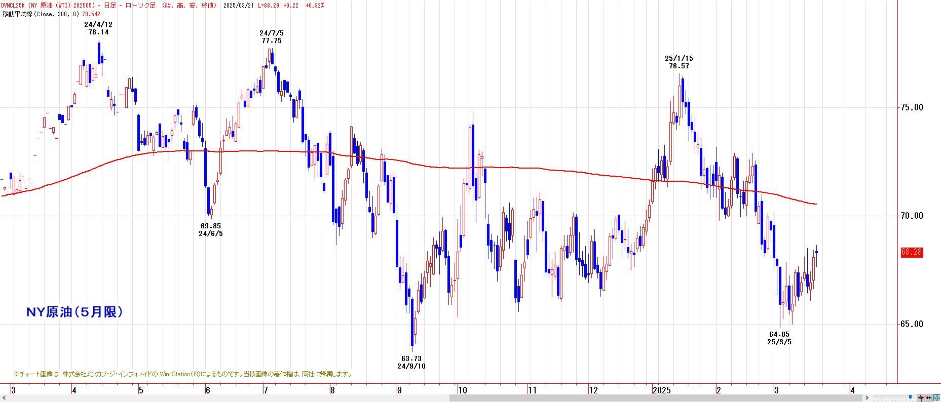 昨晩のNY原油(5月限)は、上昇した。前日比0.21ドル(0.3%)高の1バレル68.28ドルで取引を終えた。トランプ米大統領による関税政策への警戒が後退し、原油先物に買いが入った。