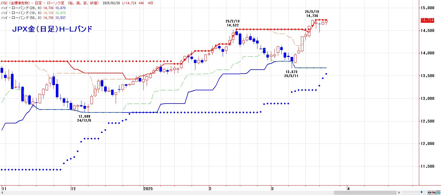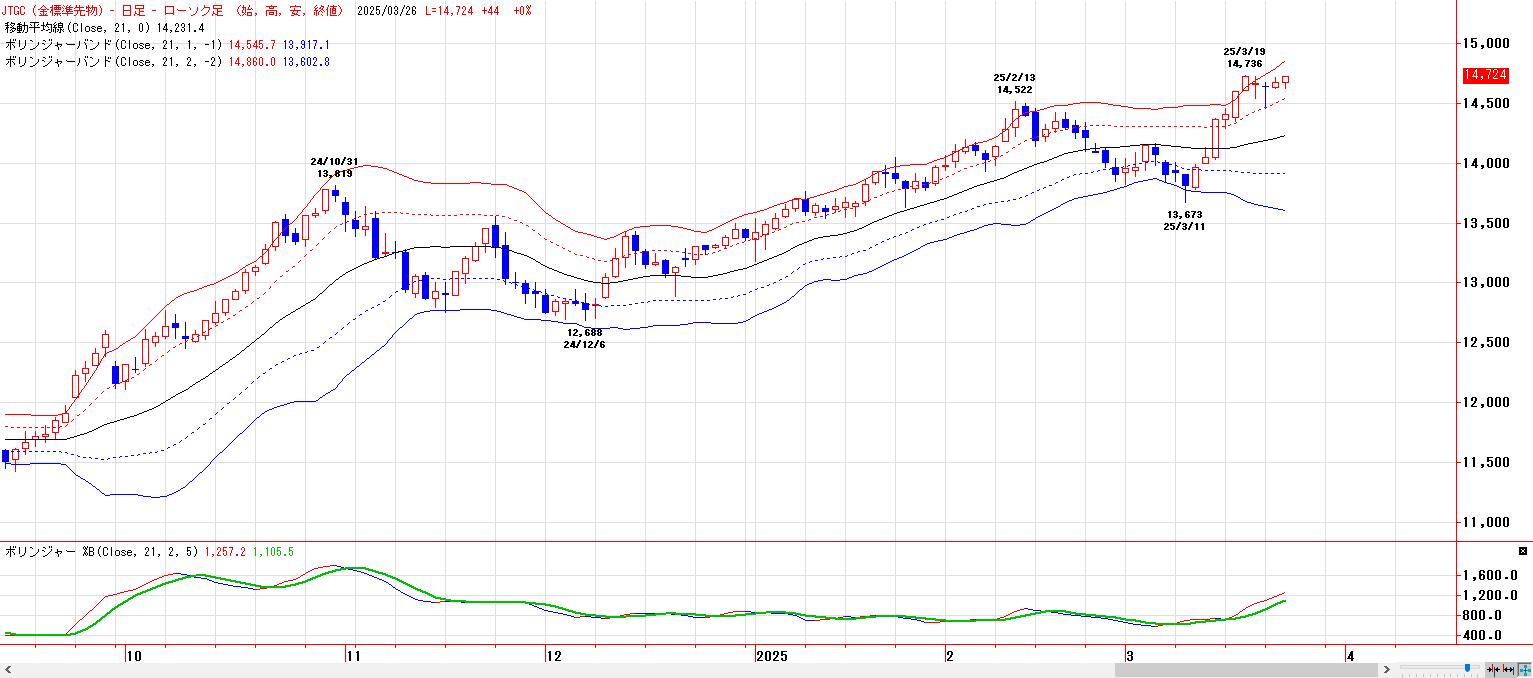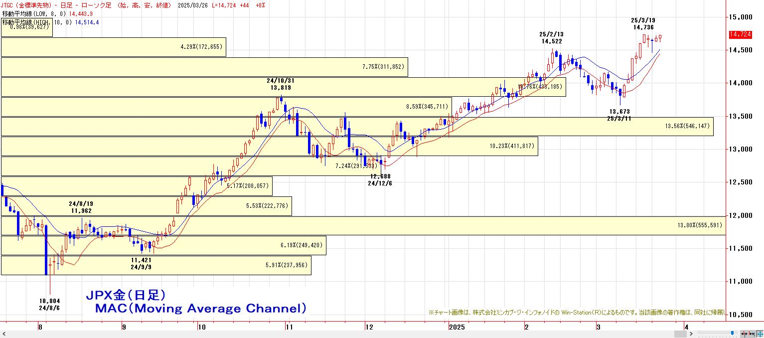 2024年12月安値〜2025年2月高値までの上昇に対する半値押し(13605円)〜61.8%押し(13389円)の価格帯別出来高の厚い水準が下値支持帯として機能し、押し目買いが再開し、MACでは、3月17日にヒットした買いのトリガー継続。LMA(14443円)〜HMA(14514円)を下値支持帯とした押し目買い基調。