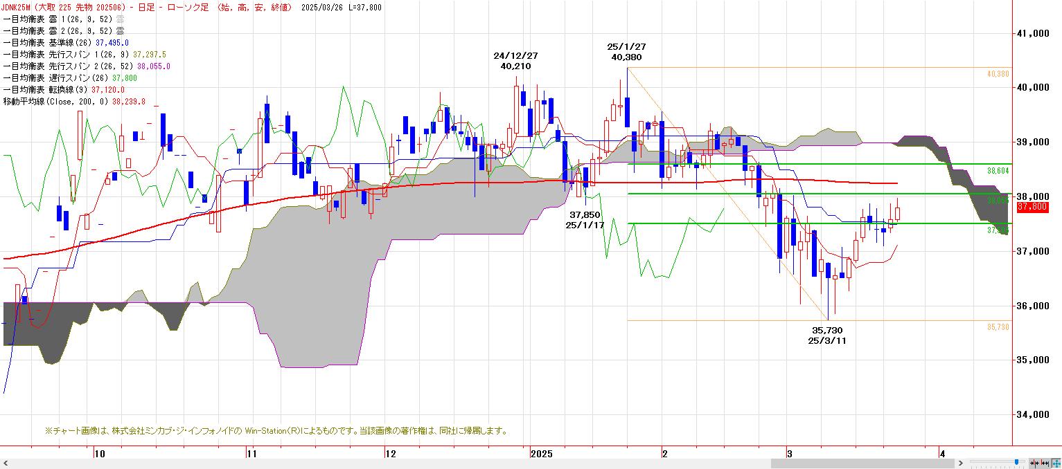 一目均衡表からの下値目標、N=37340円、V=37100円に続き、E=36090円達成。その後、心理的節目35000円〜35500円が下値支持帯として意識され反発。基準線を回復してきた。次の上値抵抗の200日移動平均線の攻防戦へ。