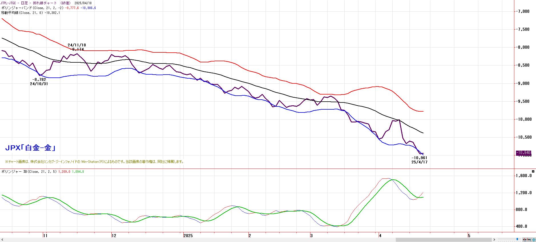 「白金−金」の鞘は、中心線で上値を抑えられ、順張り型の「金買い・白金売り」のバンドウォーク形成中。-2σ水準でも、逆張り対応は避けたい時間帯。