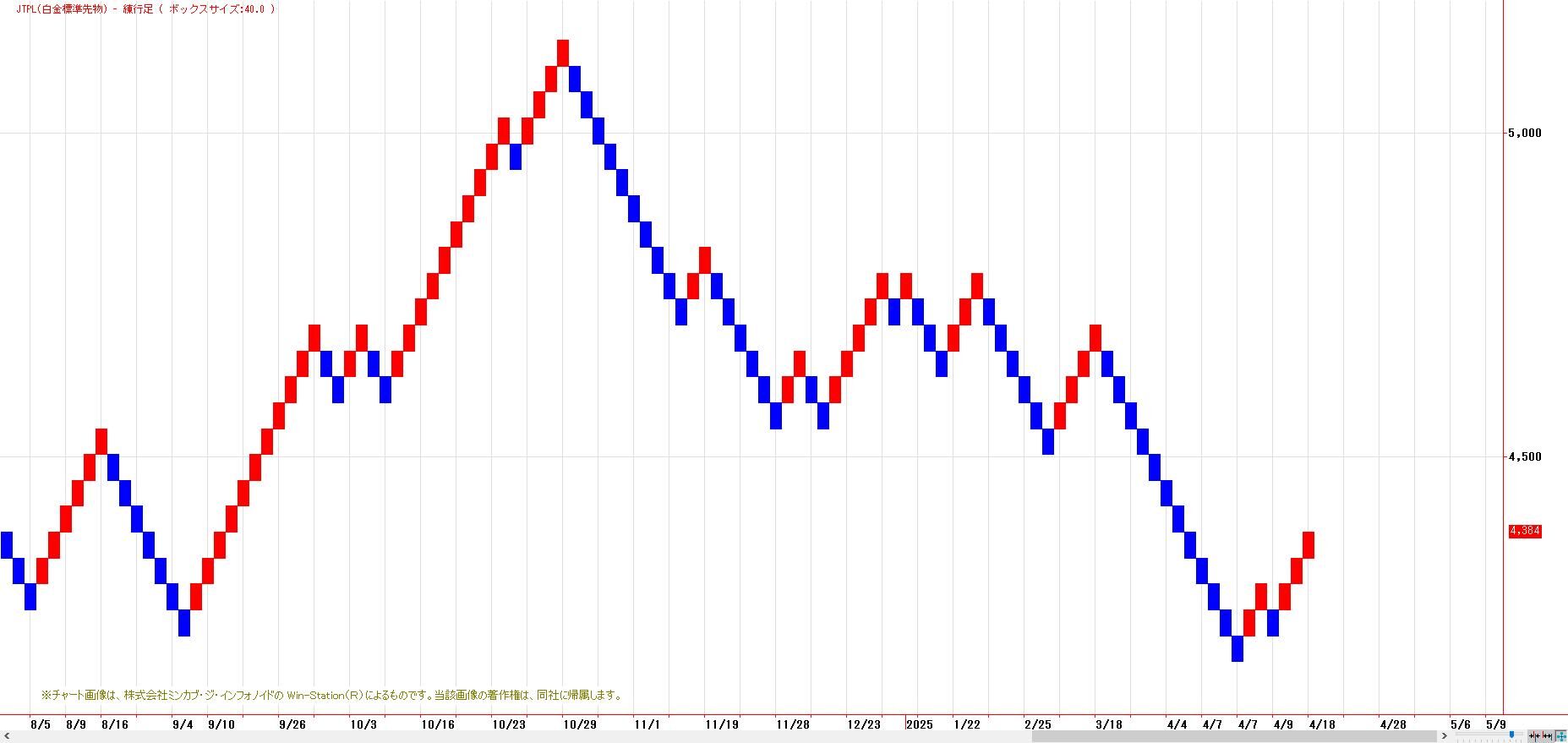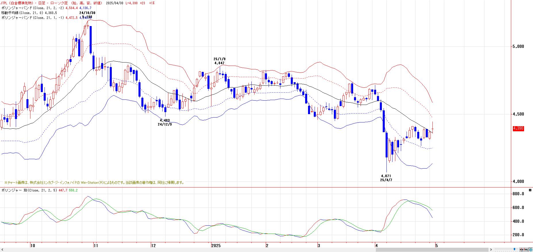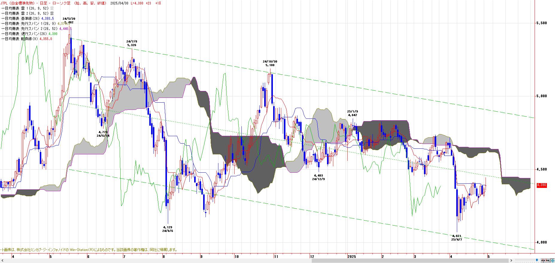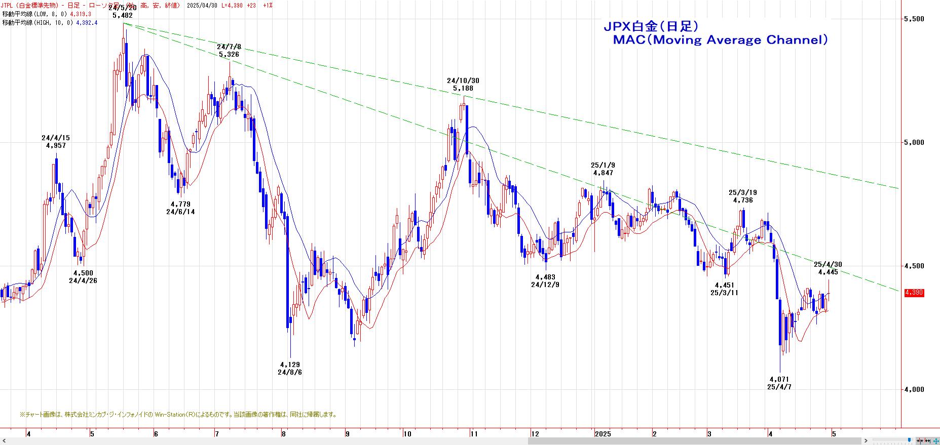 本日のJPX白金は、続伸。MACでは、4月18日にヒットした買いのトリガー継続。LMA(4319円)〜HMA(4392円)を下値支持帯とした押し目買い基調。