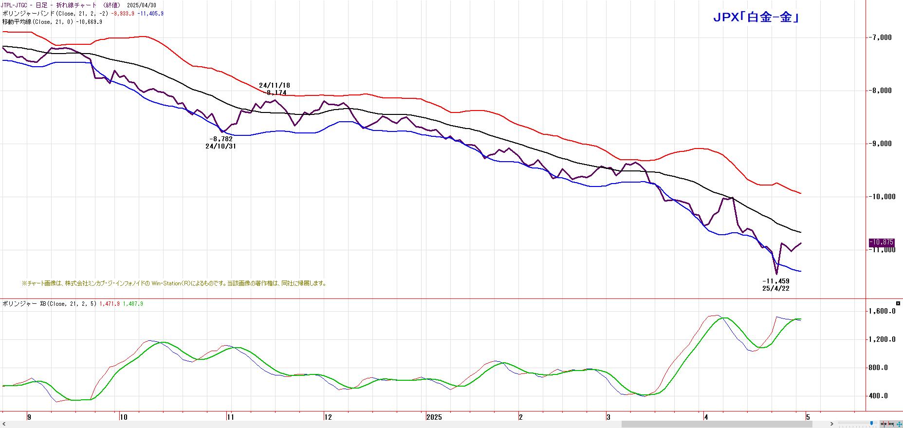 「白金−金」の鞘は、「白金売り・金買い」のバンドウォーク継続。株価堅調が明確になってくると、中心線を上抜き、途転になる可能性も。