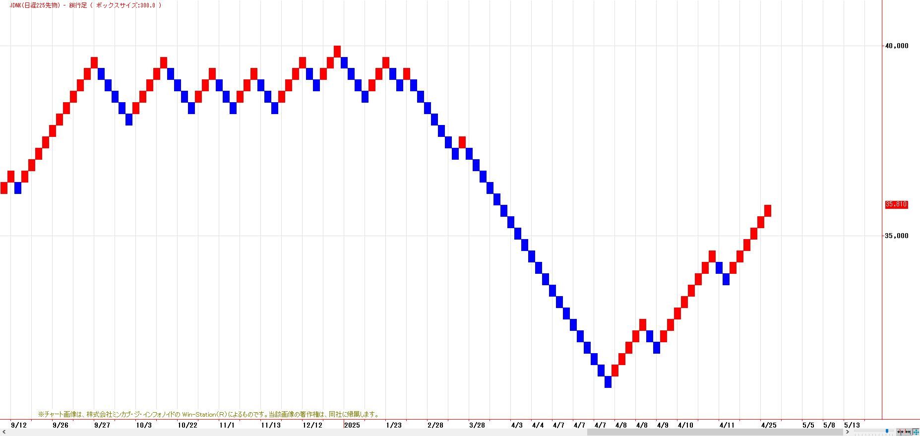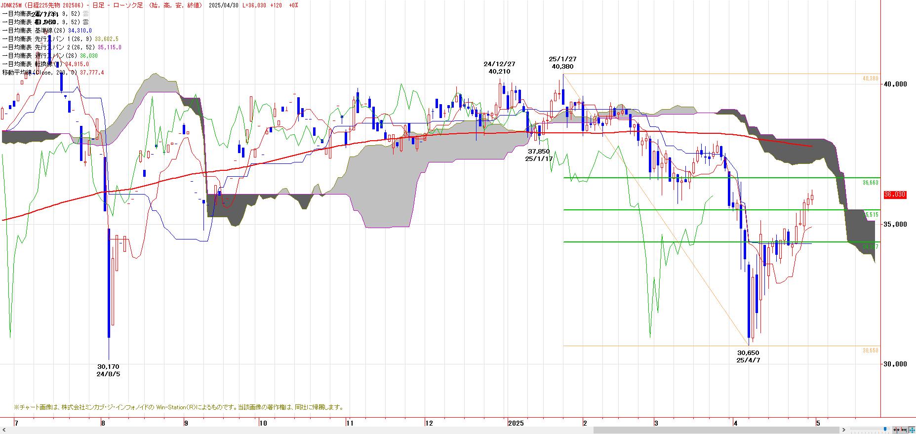 一目均衡表からの下値目標、N=33320円、E=31080円を達成後の自律反発局面。1月27日高値〜4月7日安値までの下げ幅に対する半値戻し(35515円)達成。61.8%戻しは、36663円。