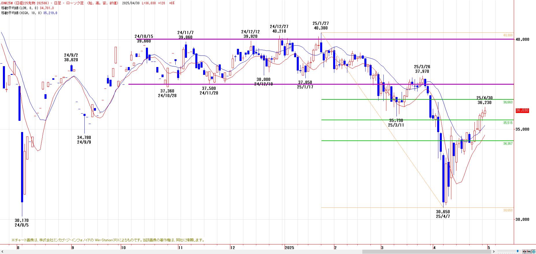 MACでは、4月18日にヒットした買いのトリガー継続。LMA(34701円)〜HMA(35219円)を下値支持帯とした、押し目買い基調。
