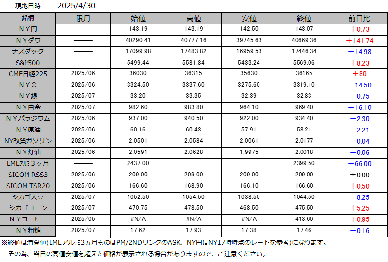 2025/05/01 寄付き予想 貴金属市場は、金が-55円前後、 白金が、-30円前後、 原油市場が、-1100円前後、 ゴムRSS3号が、-1.9円前後、 穀物市場は、コーン±0円前後で始まる見通し。 日経225は、続伸して始まる見通し。 シカゴ日経平均先物(6月限) ドル建て: 36235( +205)大阪終値比 円建て : 36165( +135)大阪終値比 「朝だ夜明けだ」カテゴリの最新記事 < 前の記事次の記事 >