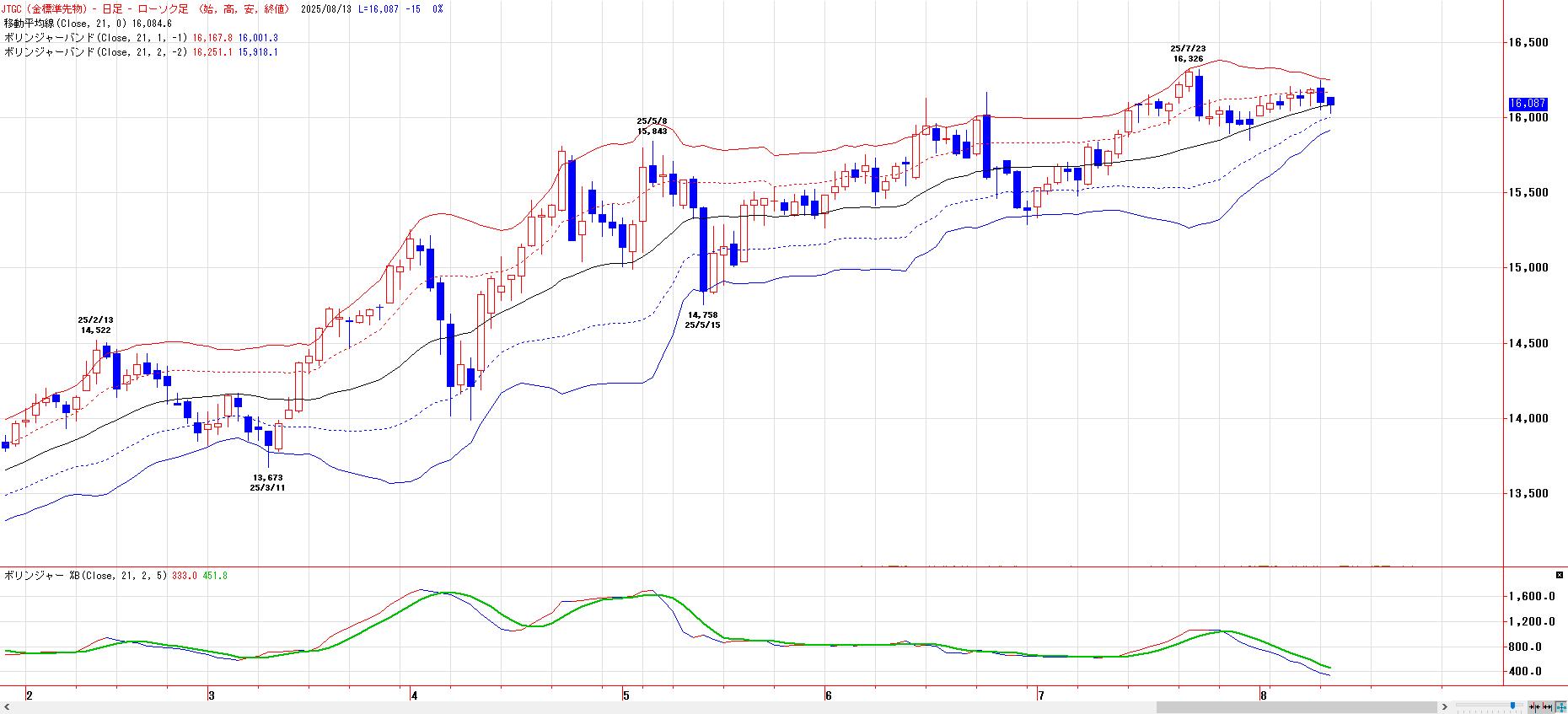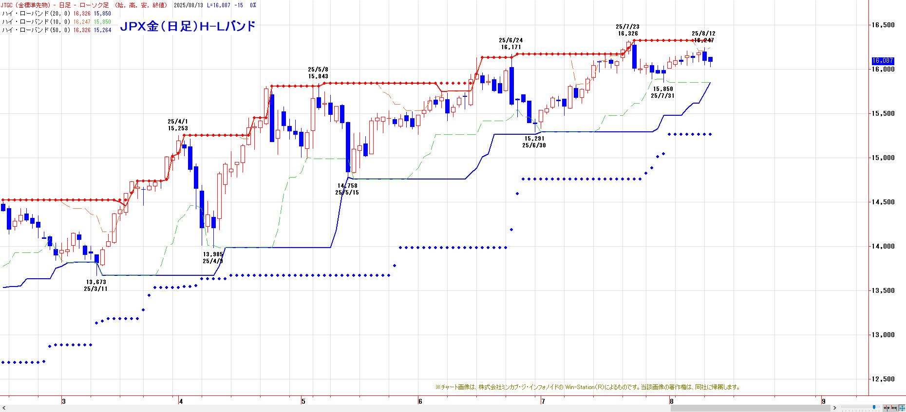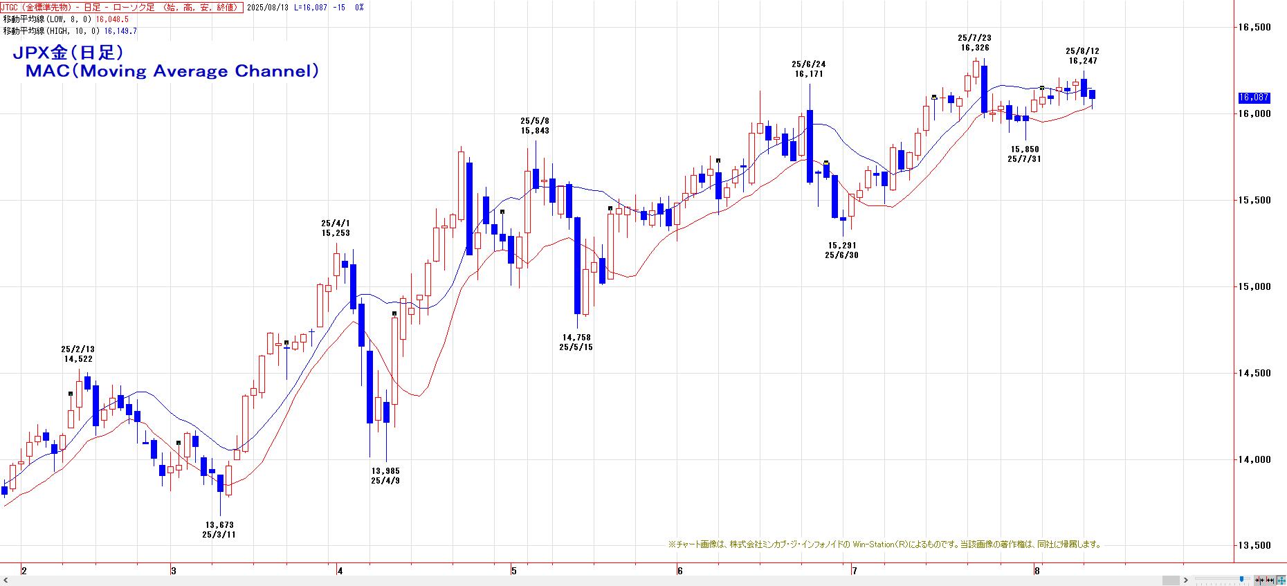 MACでは、8月7日にヒットした買いのトリガー継続。LMA(16048円)〜HMA(16149円)を下値支持帯とした押し目買い基調。