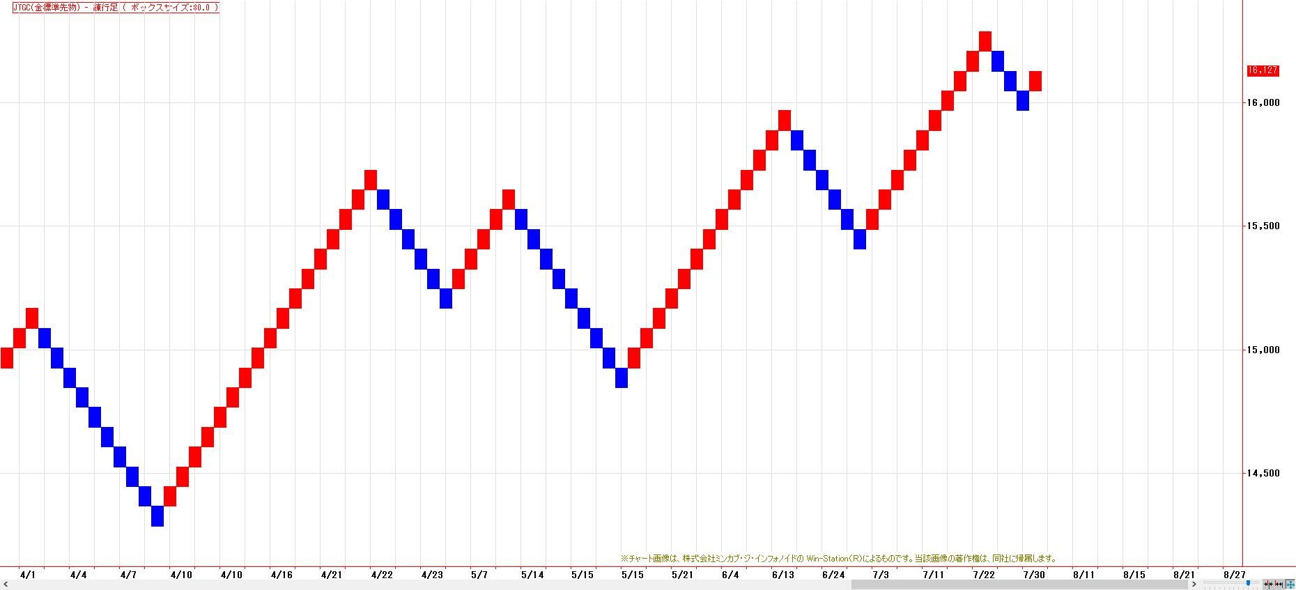 20日間高値を更新。50日間高値更新してくると、トレンドフォロー型指標は、軒並み陽転となる。一方、10日間安値(15850円)を割り込むと、トレンドフォロー型の買い玉は手仕舞われる。