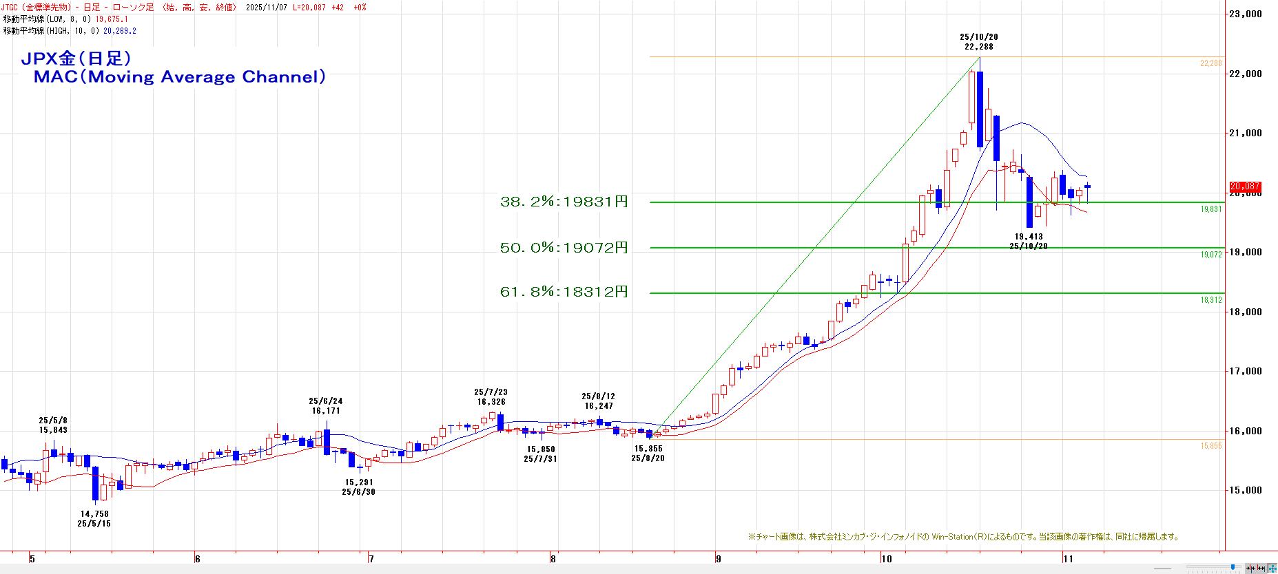 8月20日安値〜10月20日高値までの上昇に対する38.2%押しは、19831円、50%押しは19072円、61.8%押しは18312円。