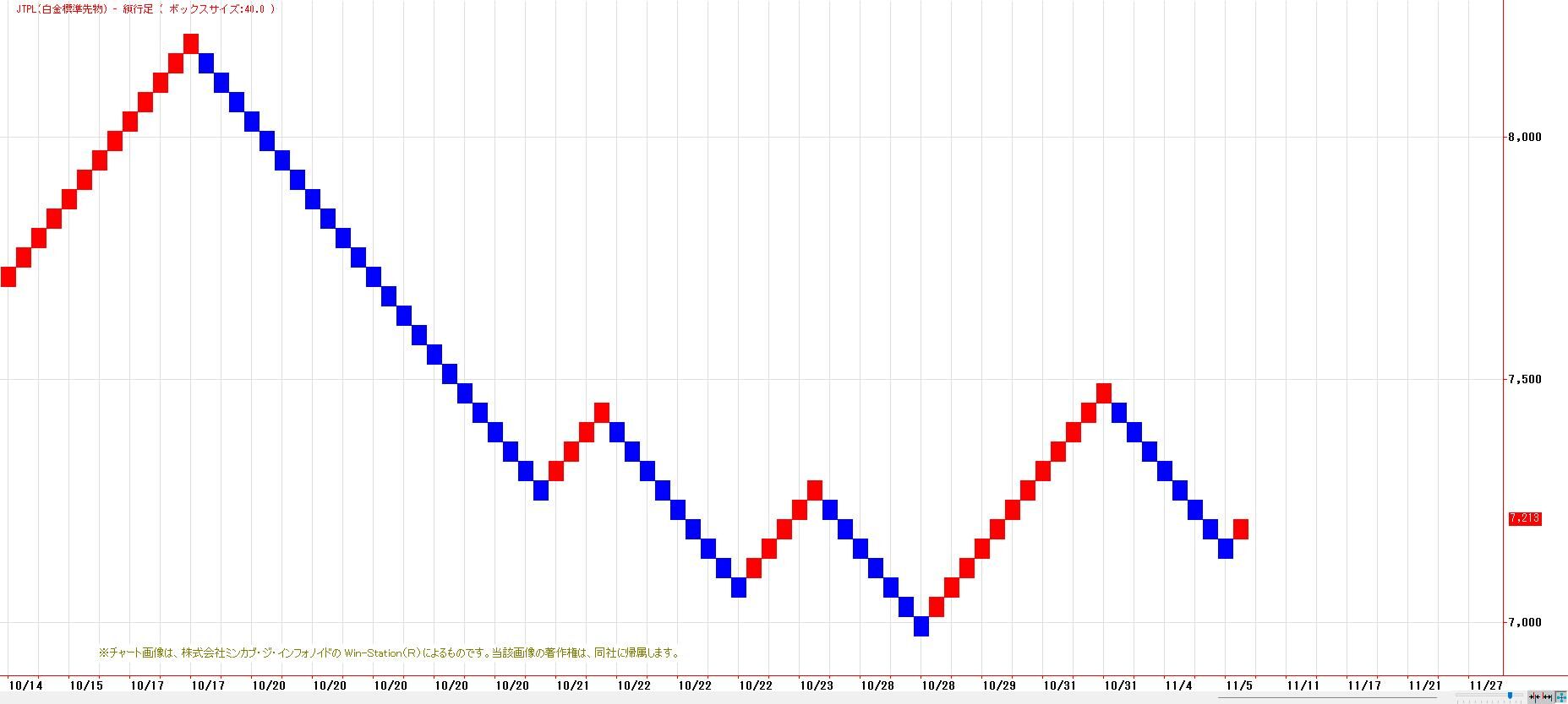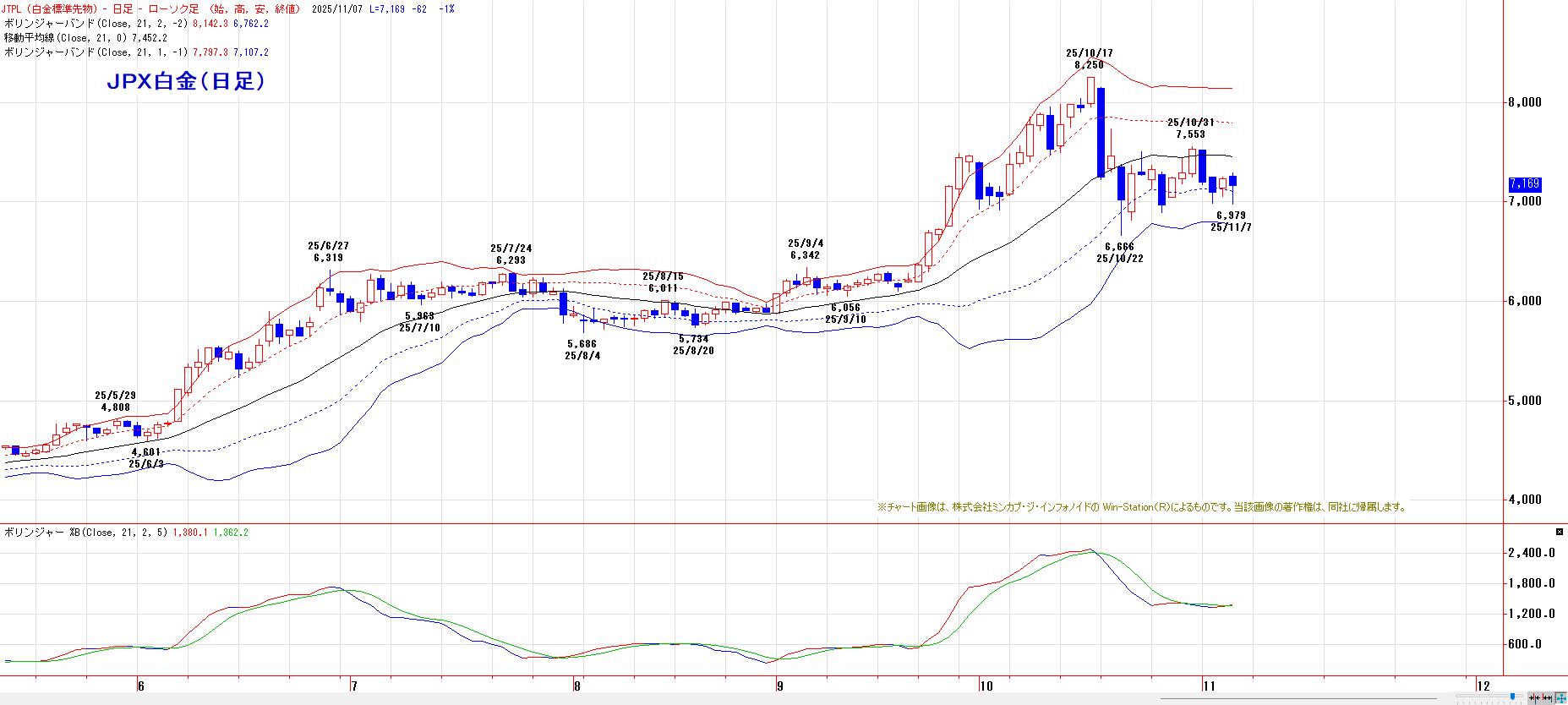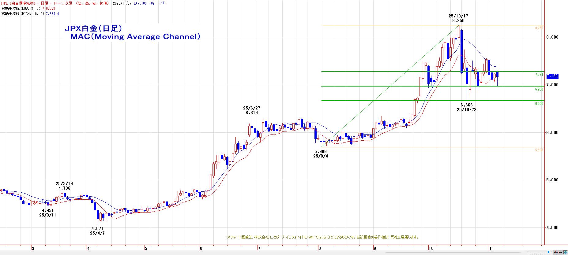 本日のJPX白金は、反落。MACでは、売り・買いともにシグナルなしの状態。終値ベースでLMA(7070円)〜HMA(7374円)のレンジ放れ待ち。