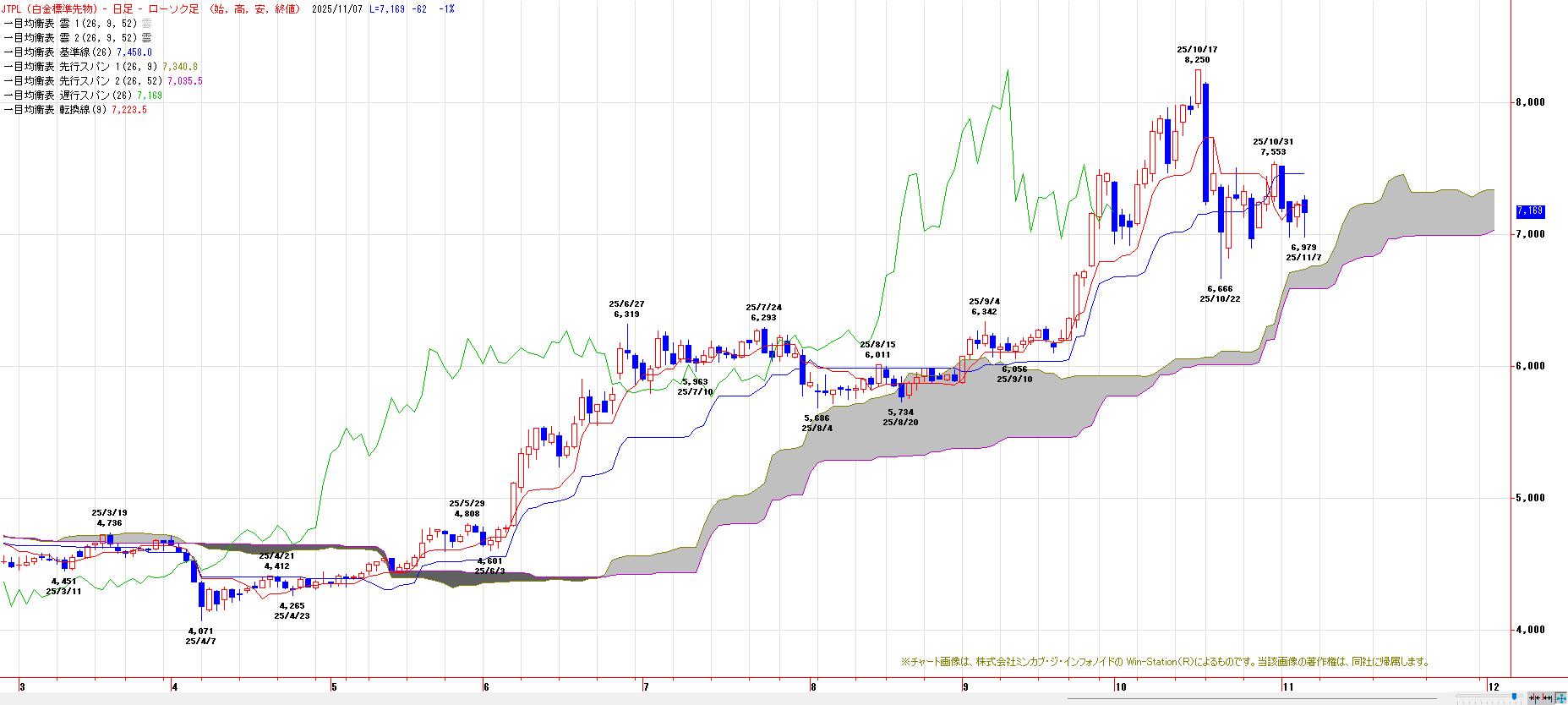 6500円を割り込んでくると、日柄経過と共に雲の上から下へ落ち込む流れへ。また、7000円台維持でも、日柄経過と共に雲の上から雲の中へ突入する。雲の上を維持するためには、7500円台回復が必要。