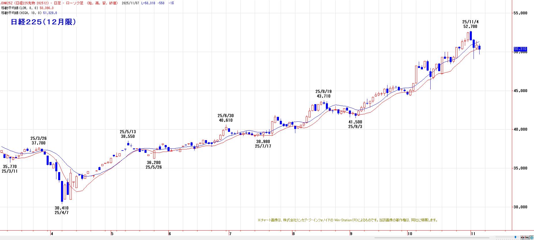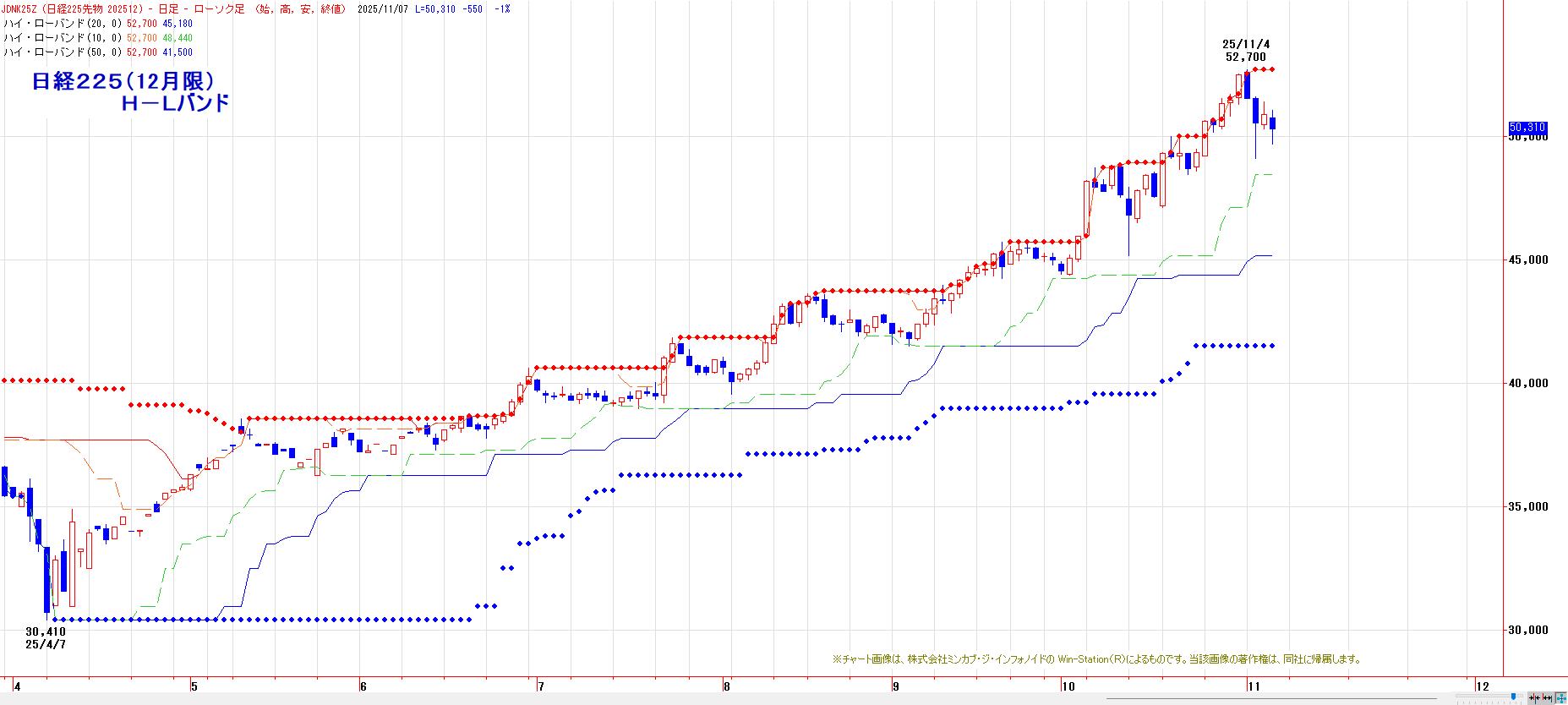 20日間・50日間高値更新で、多くのトレンドフォロー系指標は陽転のままだが、来週早々に10日間安値が、11月5日の下ヒゲ安値(49110円)水準にまで切り上がる。