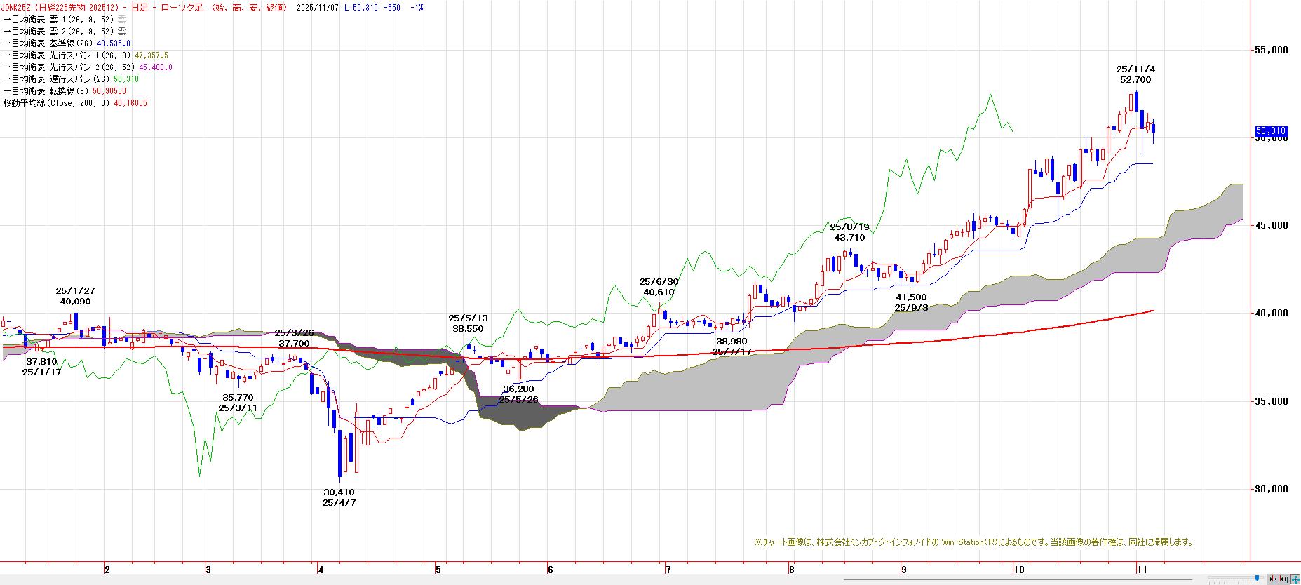 4月安値を起点とした上昇トレンド継続だが、転換線割れで基準線が意識される流れ。心理的節目50000円を維持できるか否かが焦点。