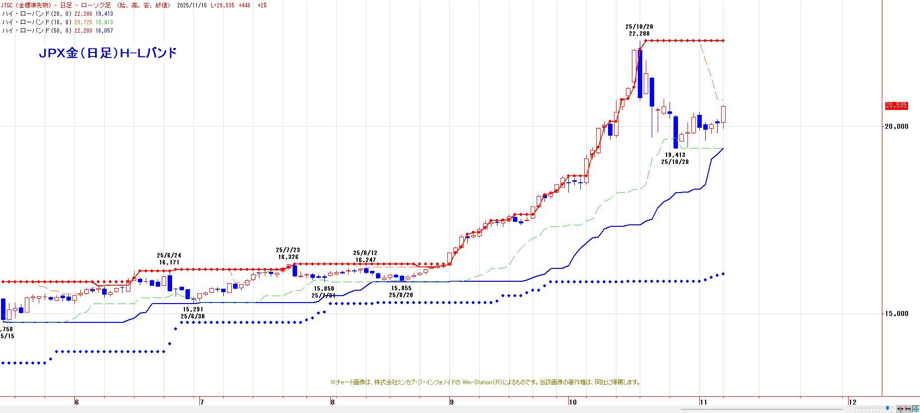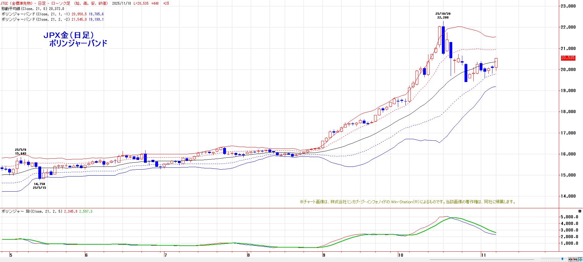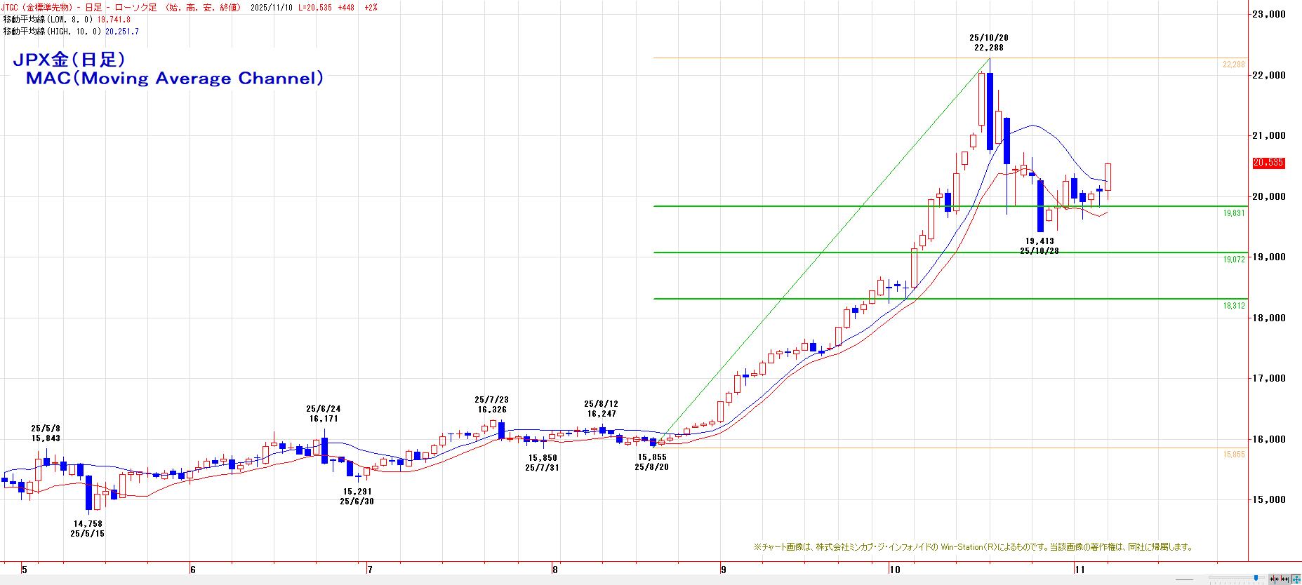 本日のJPX金先限は、大幅続伸。心理的節目20000円を維持。