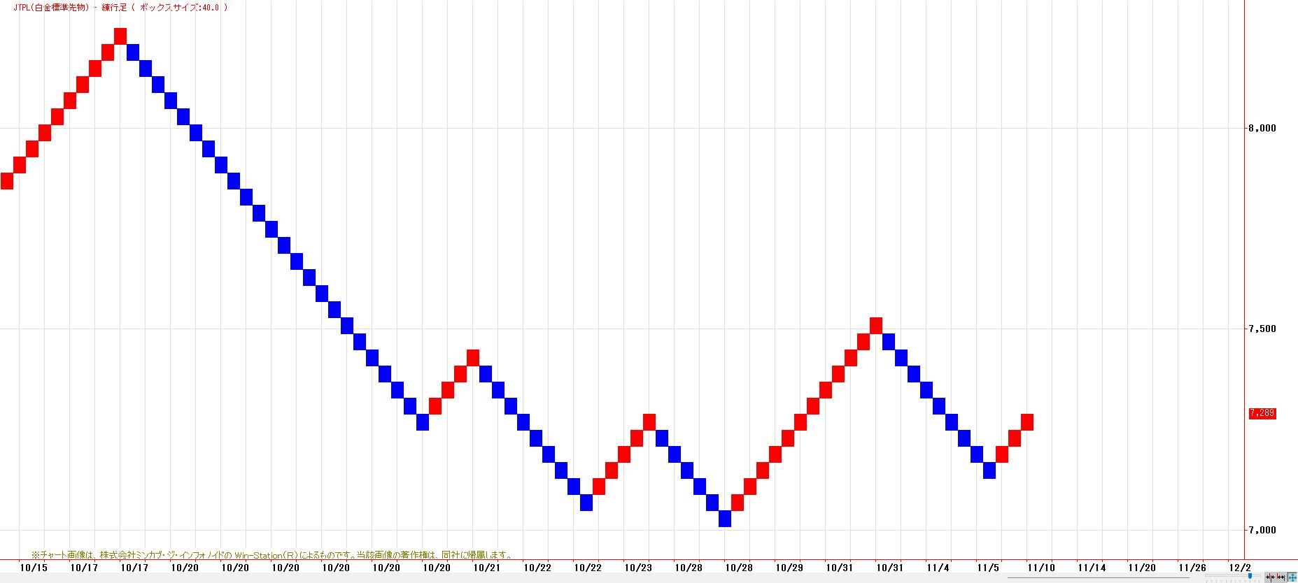 8月4日安値〜10月17日高値までの上昇に対する半値押しは6968円、61.8%押しは6665円。