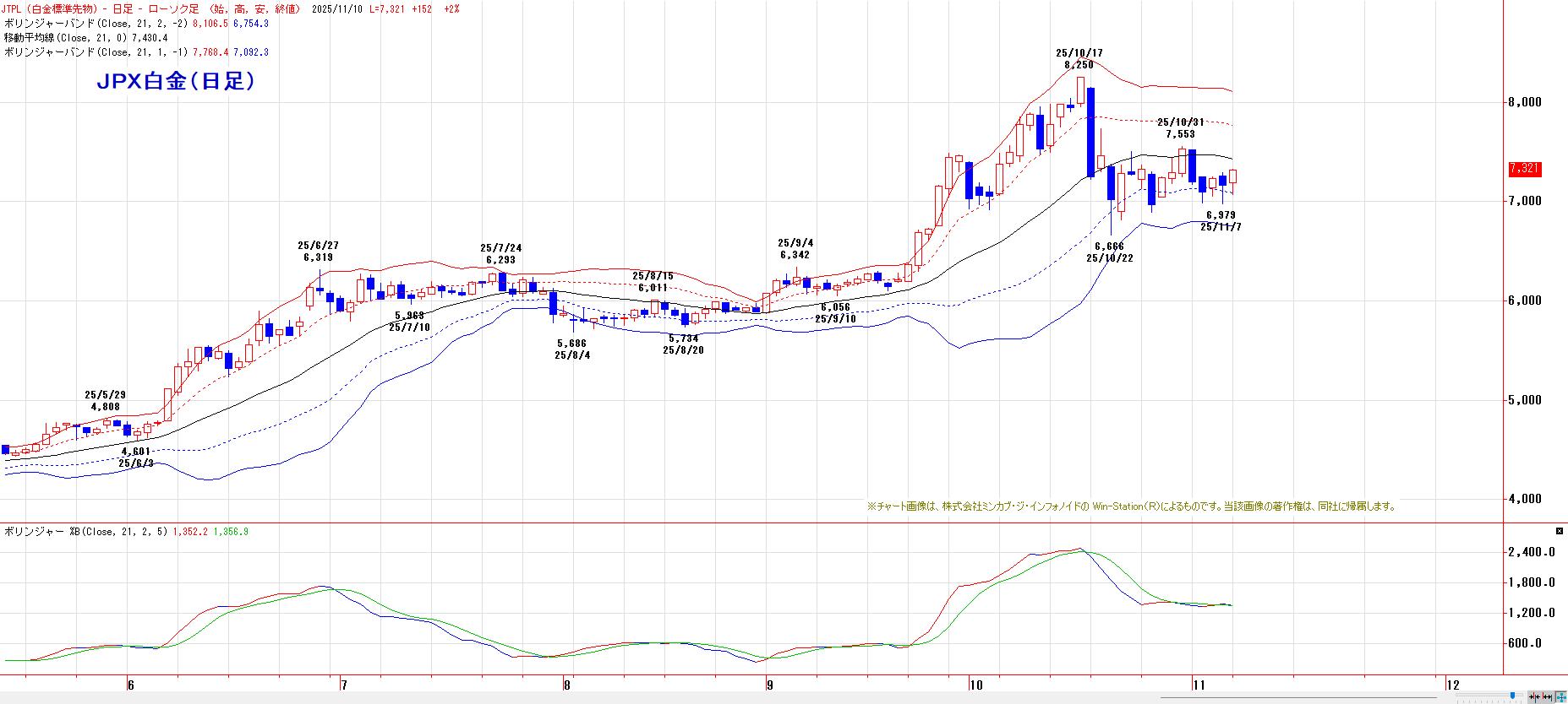 本日のJPX白金は、反発。MACでは、売り・買いともにシグナルなしの状態。終値ベースでLMA(7093円)〜HMA(7356円)のレンジ放れ待ち。