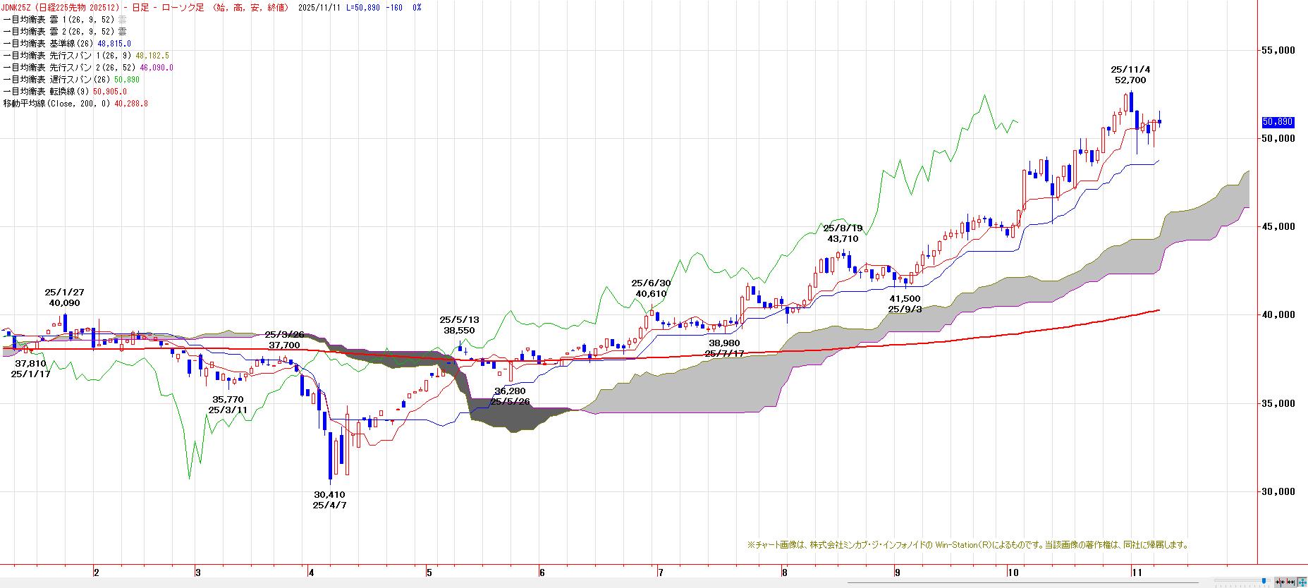 一目均衡表からの上値目標は、E=53650円、V=53230円など。