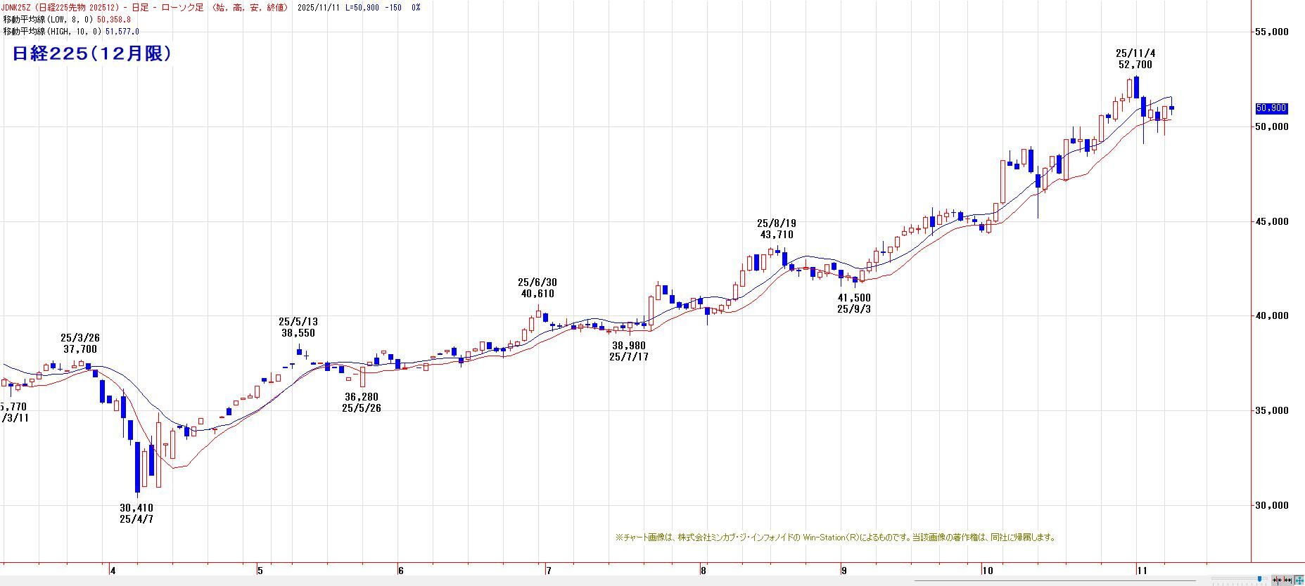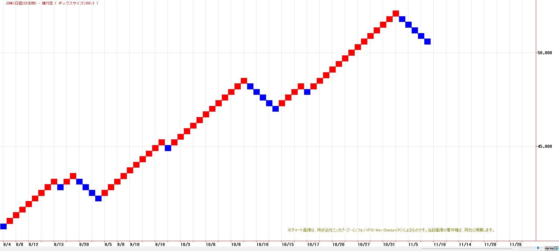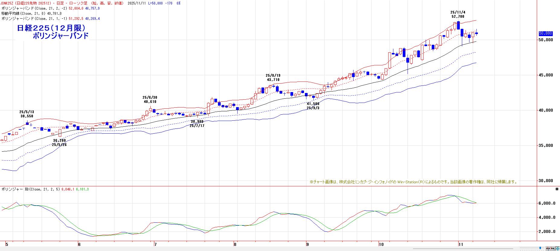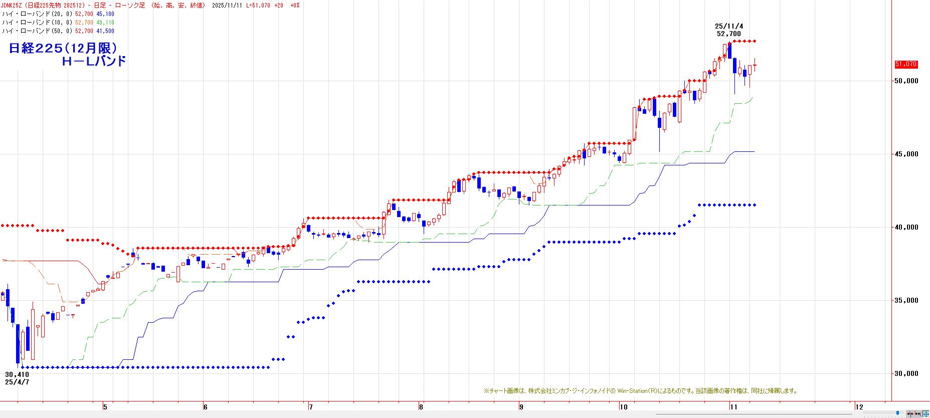 20日間・50日間高値更新で、多くのトレンドフォロー系指標は陽転のままだが、10日間安値(11月5日の下ヒゲ安値:49110円)水準にまで切り上がっており、同水準を下回ると、中長期の買い玉が手仕舞われる。