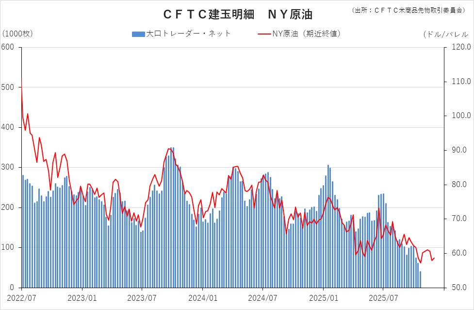 2025/12/03 CFTC建玉明細(NY原油) CFTC玉明細(10/21現在)によると大口投機玉は、39,800枚の買い越し。前週(60,991枚の買い越し)から縮小。 ※CFTCは11月19日より建玉明細の公表を再開した。今後毎週2回(火曜日、金曜日)に順次公表し、来年1月23日公表分より通常の週1回(金曜日)公表に戻る。 「CFTC建玉明細」カテゴリの最新記事 < 前の記事次の記事 >