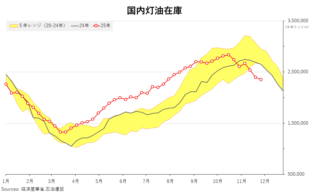 2025/12/03 石連週報(11月23日〜29日) ガソリンの週末在庫は、前週比4.5%減の167万4675キロリットル 灯油在庫が2.0%減の234万9553キロリットル 週間原油処理量は2.0%増の267万7045キロリットル 「旗は鳴る鳴る ラッパは響く」カテゴリの最新記事 < 前の記事次の記事 >