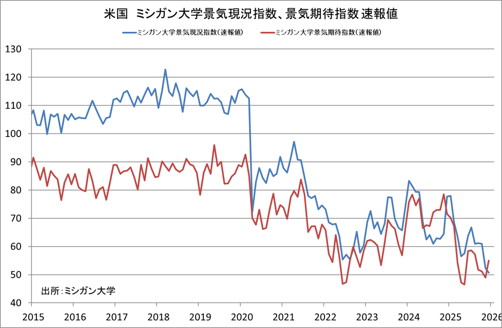 2025/12/06 米ミシガン大学消費者信頼感指数 米ミシガン大学が5日発表した12月の消費者信頼感指数(速報値)は53.3と、11月確報値の51.0から上昇した。事前予想は、52.0への上昇。 1年先の期待インフレ率は4.1%、5年先は3.2%と、前月の4.5%、3.4%から、それぞれ低下した。 景気現況指数は50.7と予想の51.3を下回った一方、期待指数は55.0と予想の51.2を上回った。 「旗は鳴る鳴る ラッパは響く」カテゴリの最新記事 < 前の記事次の記事 >