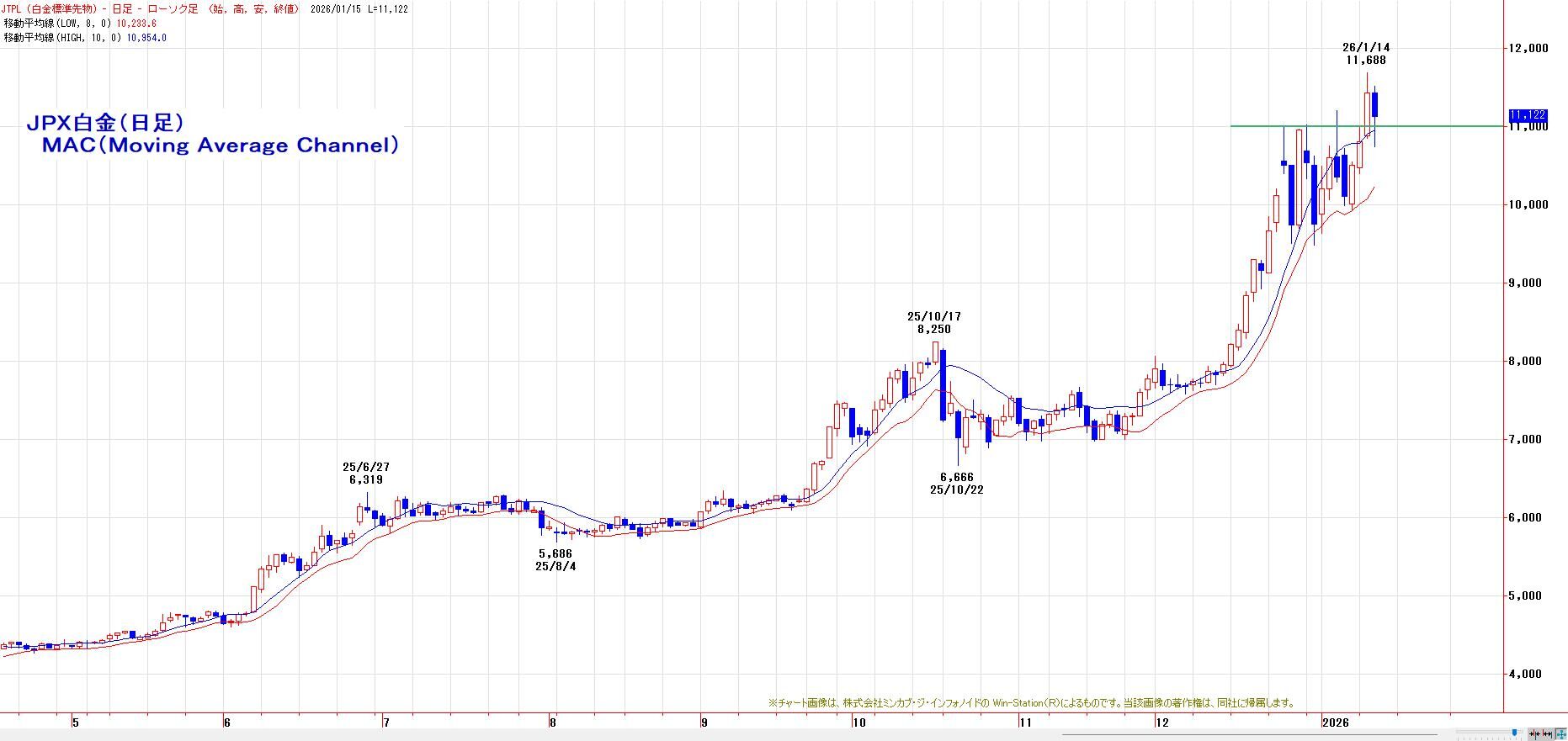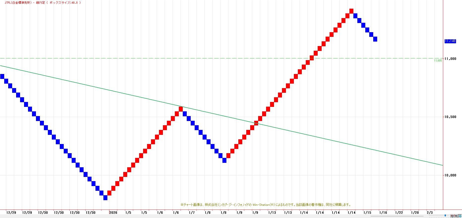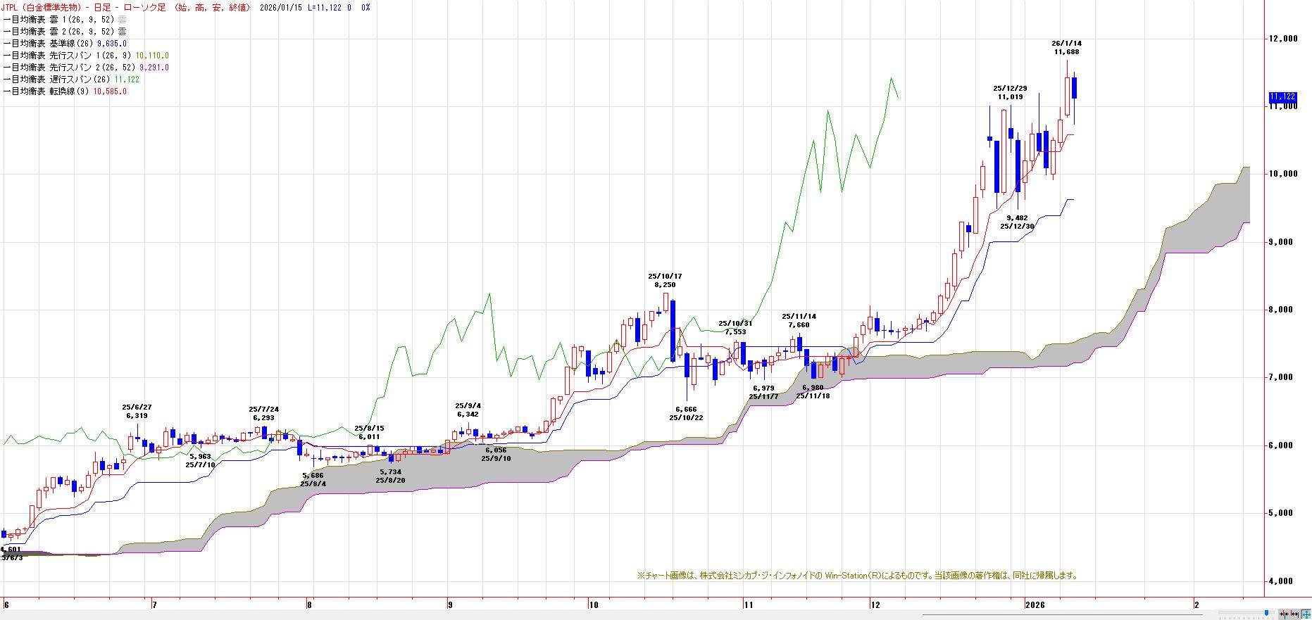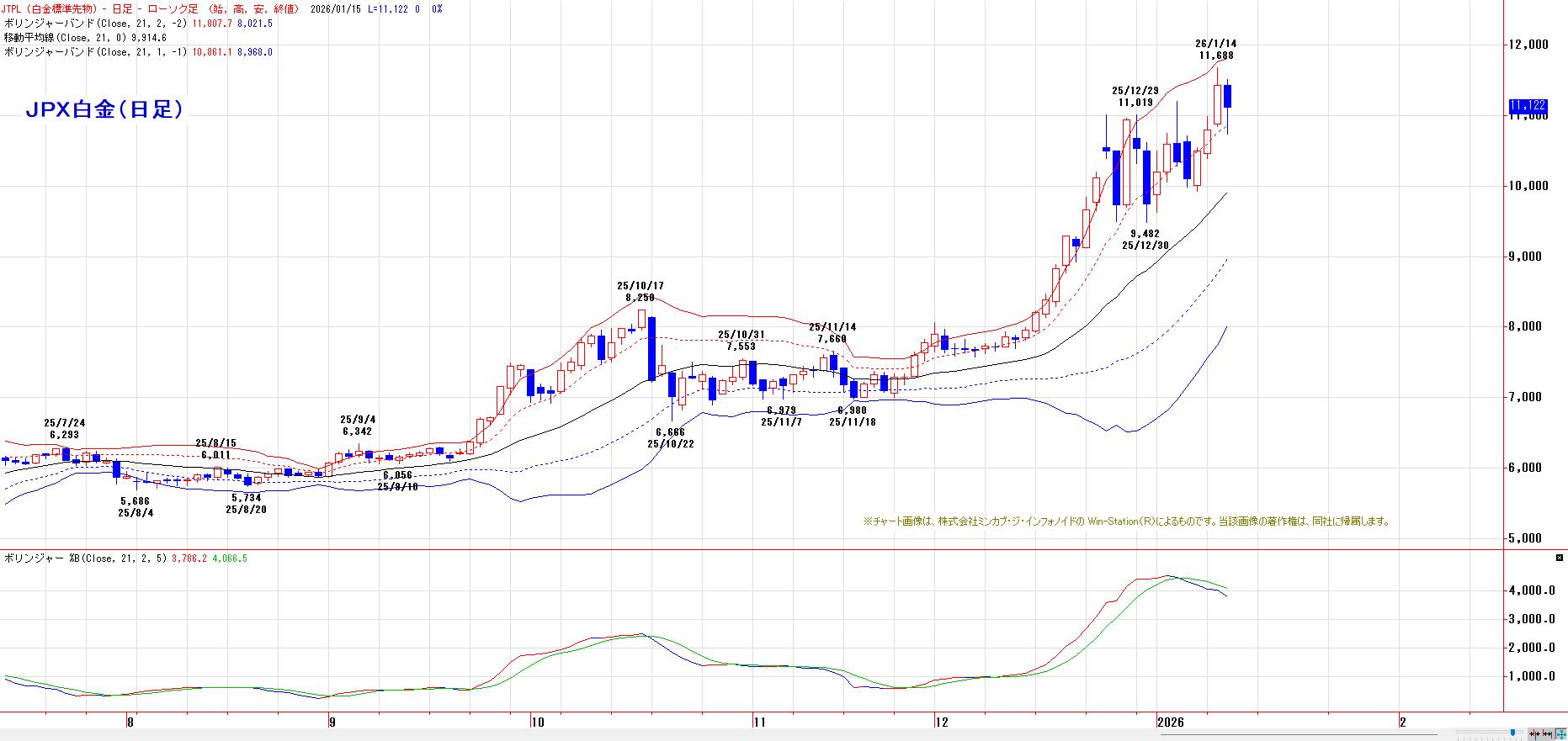 12月30日安値(9482円)〜1月7日高値(11200円)レンジを上に放れ上げ加速。心理的節目11000円〜1月7日高値が下値支持帯に変化。