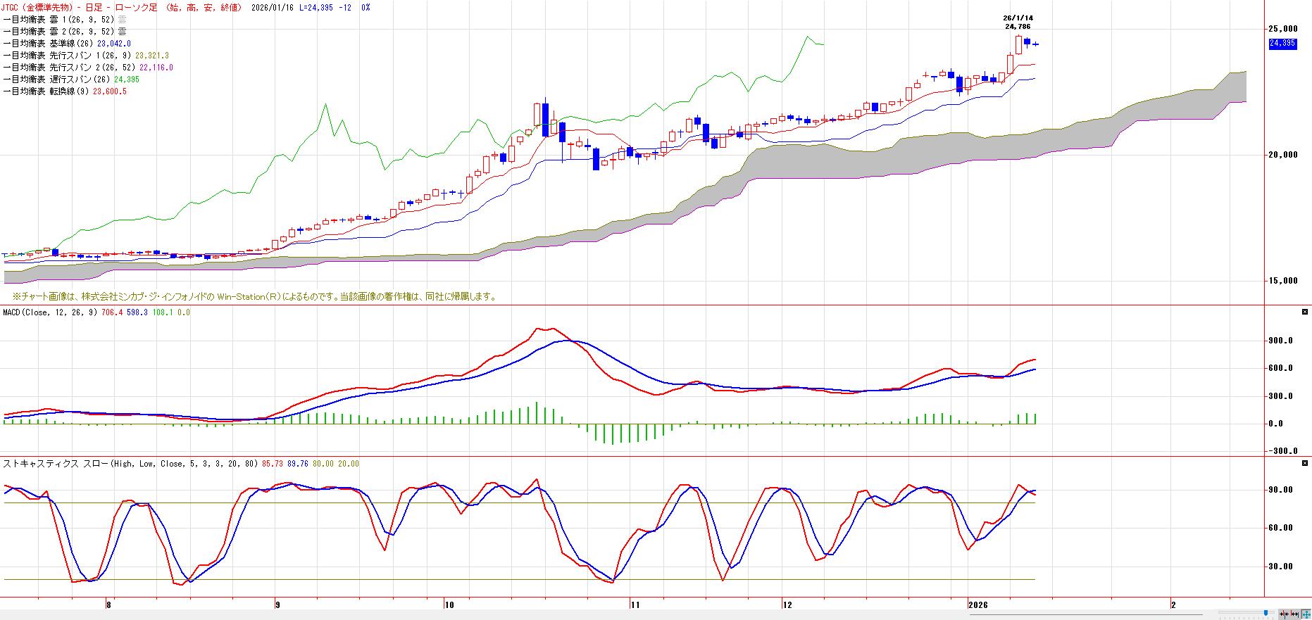 一目均衡表からの上値目標は、E=28747円、V=25163円、N=25846円などがカウント可能。基準線〜転換線が下値支持帯。