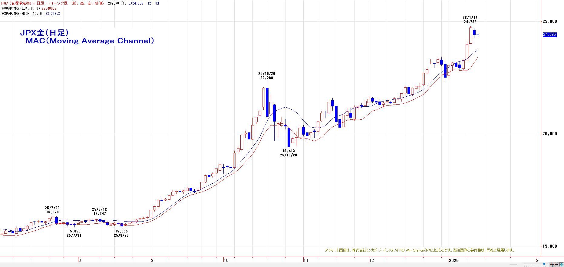 MACでは、1月6日にヒットした買いのトリガー継続。LMA(23400円)〜HMA(23726円)を下値支持帯とした押し目買い基調。