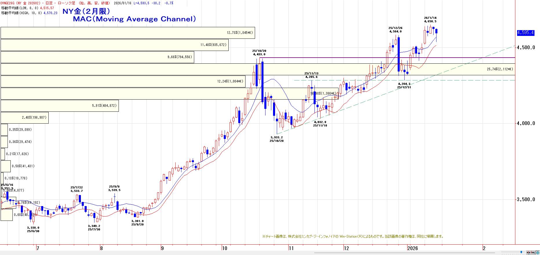昨晩のNY金(2月限)は、FRB議長人事を巡る報道をきっかけに続落した。前日比28.3ドル安の1トロイオンス4595.4ドルで終えた。ハセット氏がFRBの次期議長にならない可能性が高まったとの見方から米金利が上昇したことが嫌気された。地政学リスクの高まりなどを背景に連日で最高値を更新したが、19日の米祝日休場を前に持ち高調整や利益確定の売りも出た。