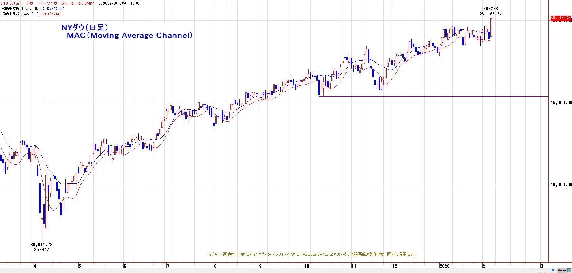 昨晩のNYダウは大幅反発し、前日比1206ドル95セント高の5万0115ドル67セントで終えた。4週間ぶりに最高値を更新し、初めて節目の5万ドル台に乗せた。下げが目立っていたソフトウエア株の売りが一服したことなどから半導体株などを中心に買いが広がった。