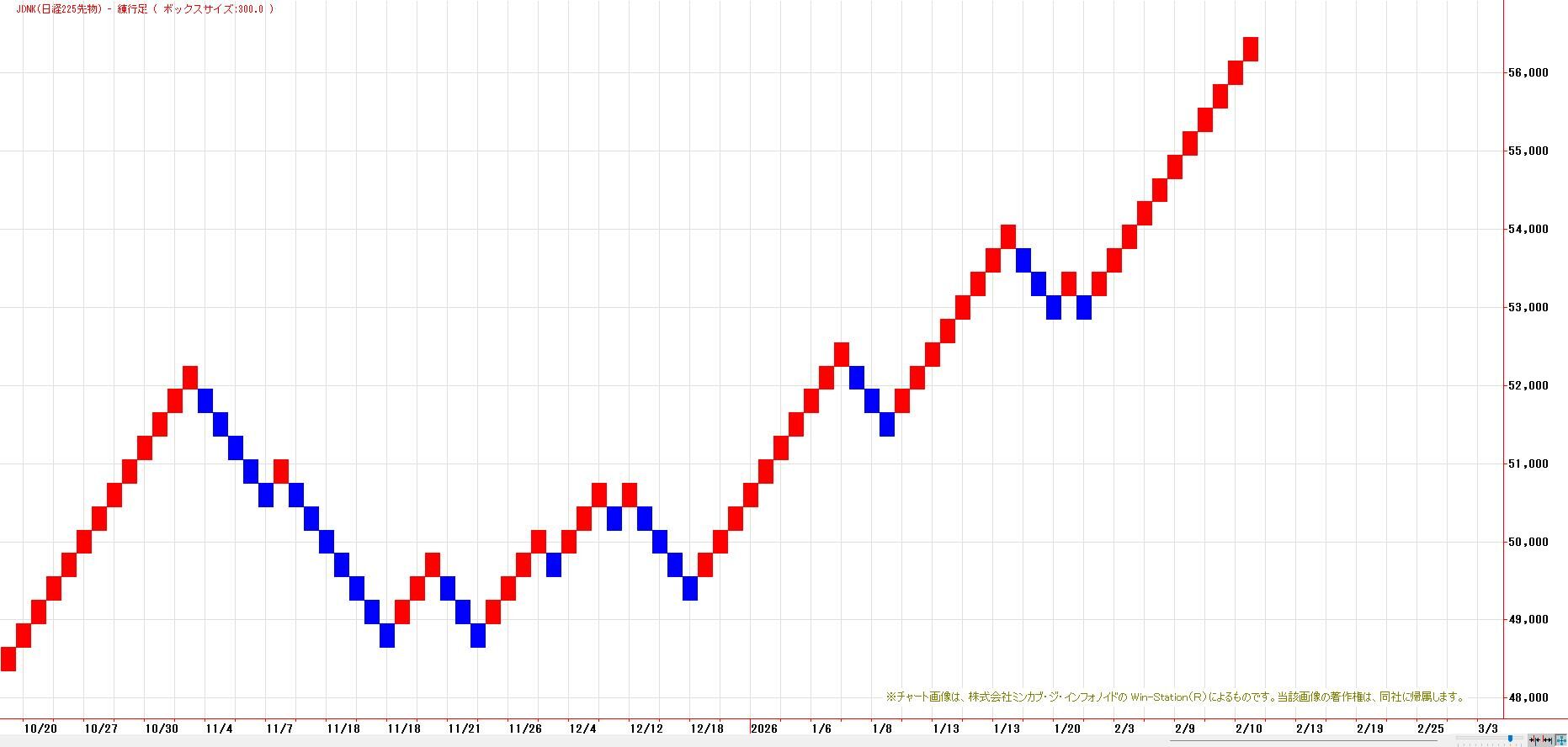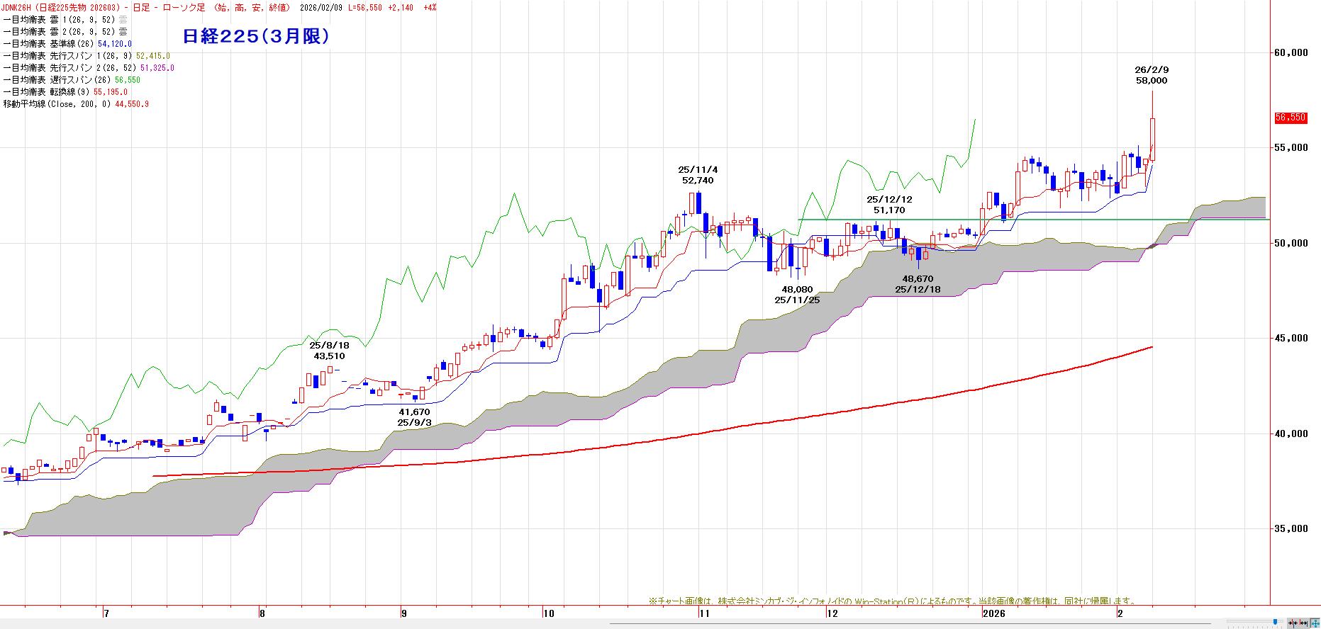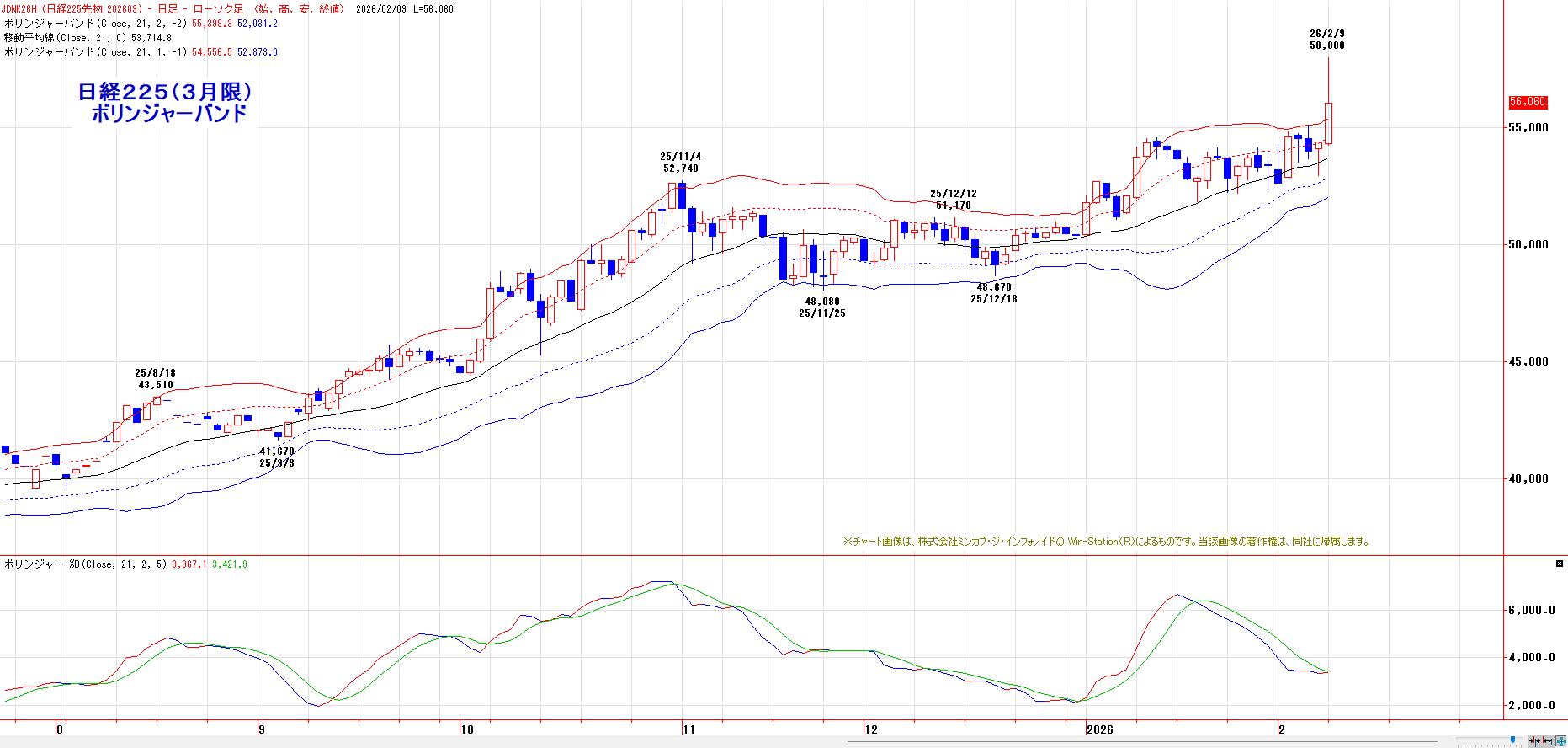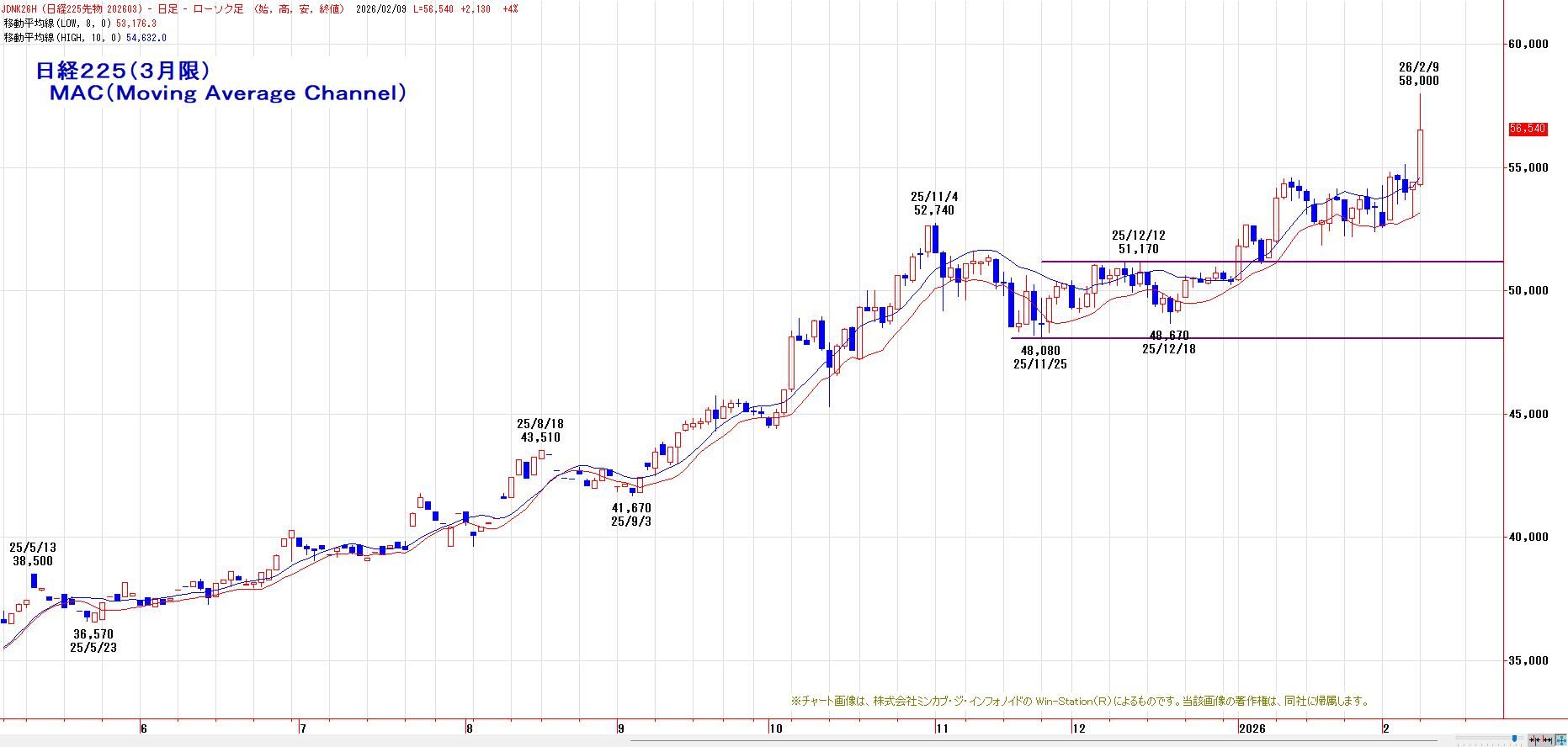 MACでは、2月4日にヒットした買いのトリガー継続。LMA(53176円)〜HMA(54632円)を下値支持帯とした押し目買い基調。