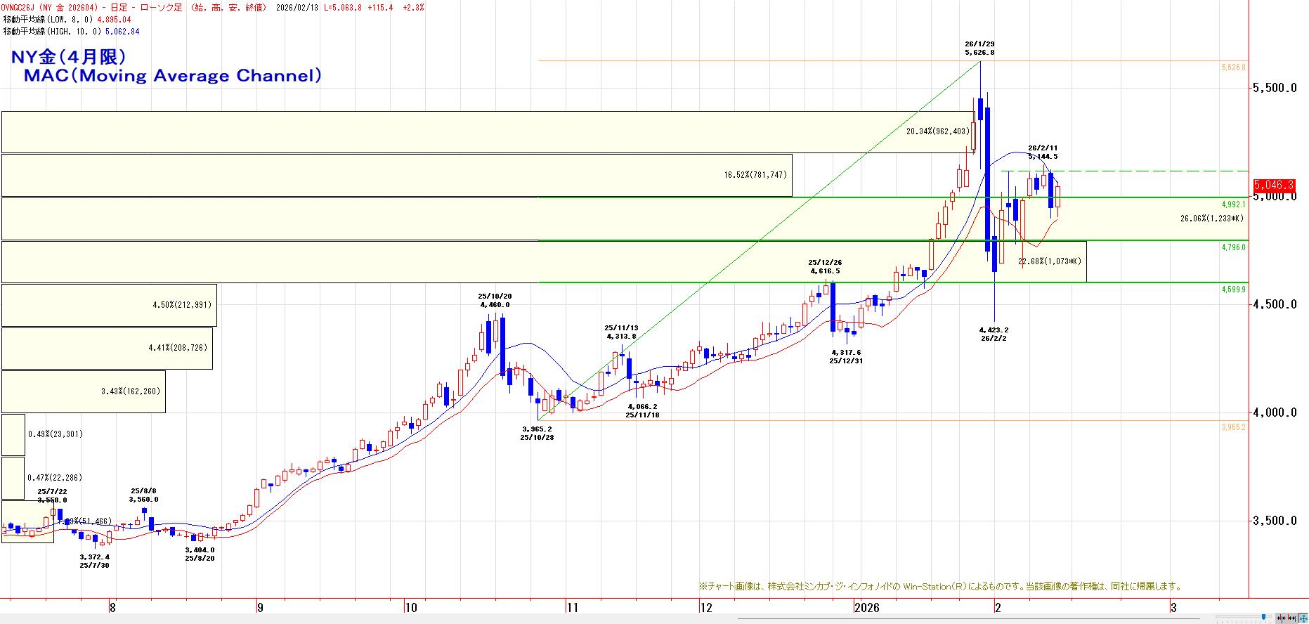昨晩のNY金(4月限)は、米長期金利の低下やドル下落に伴う割安感を背景に反発。前日比97.9ドル高の1トロイオンス5046.3ドルで終えた。