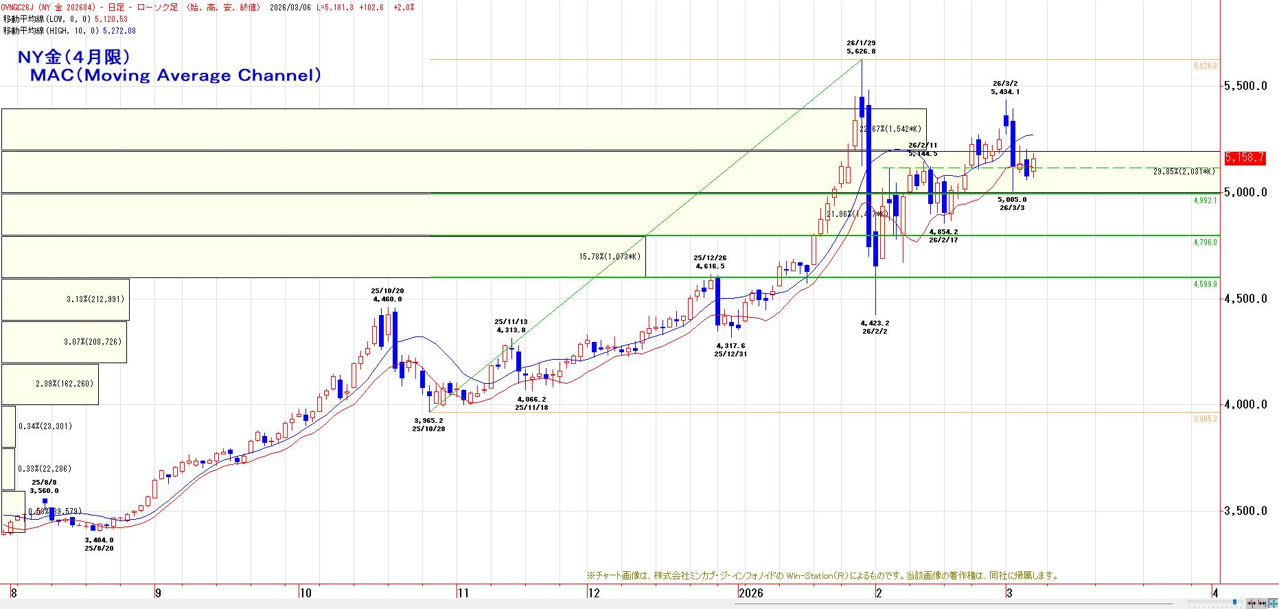 昨晩のNY金(4月限)は、低調な米雇用統計を受けて利下げ継続期待が高まり、反発した。前日比80.0ドル高の1トロイオンス5158.7ドルで終えた。