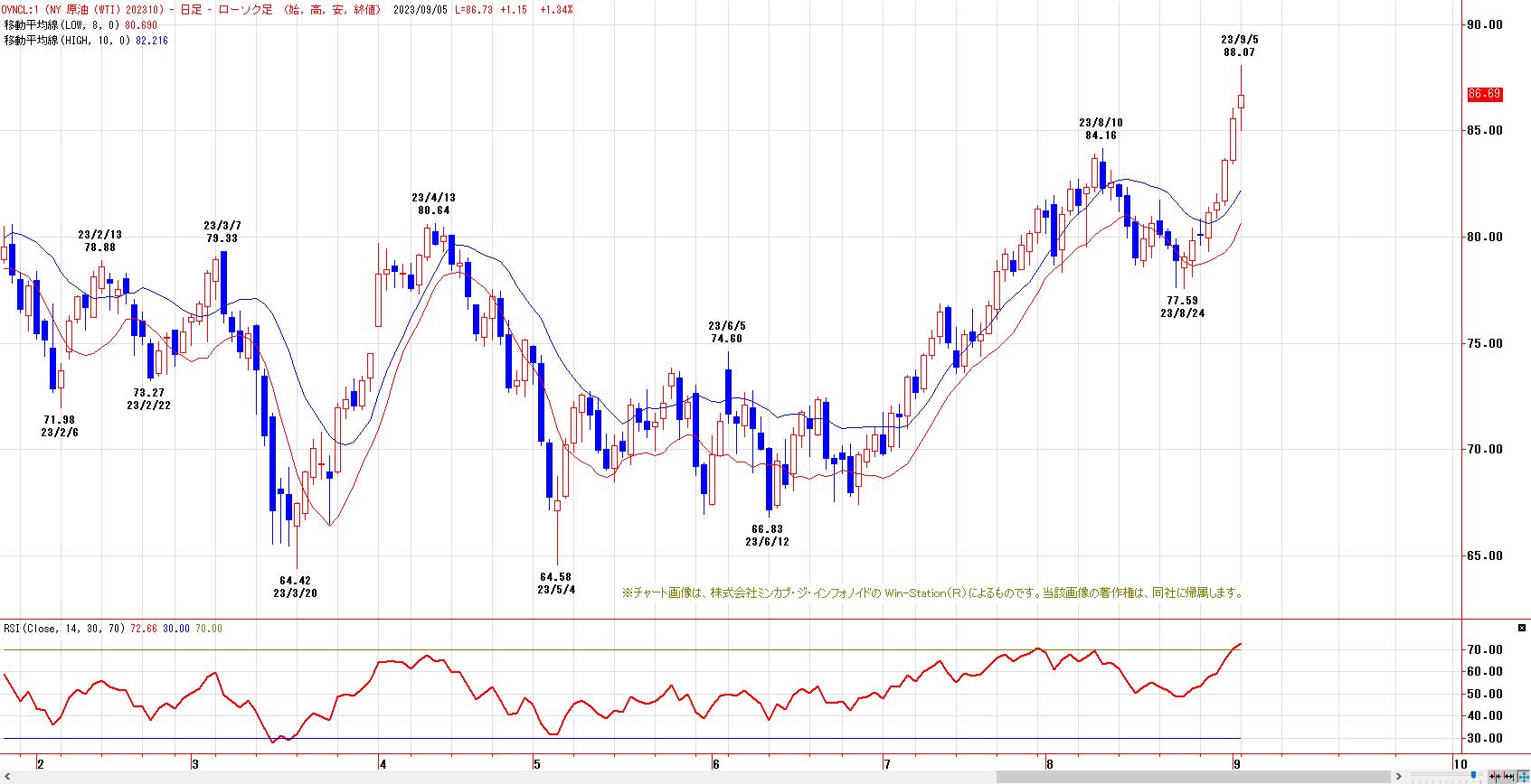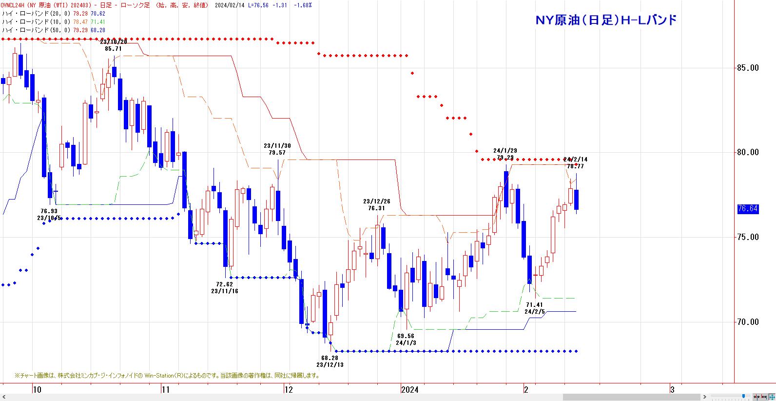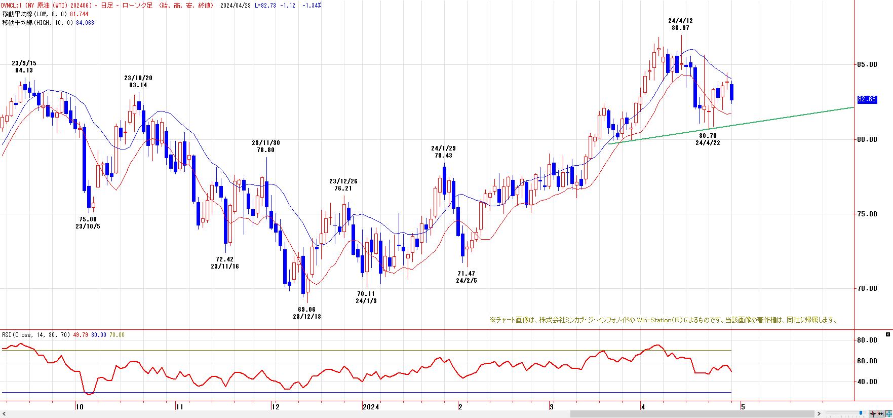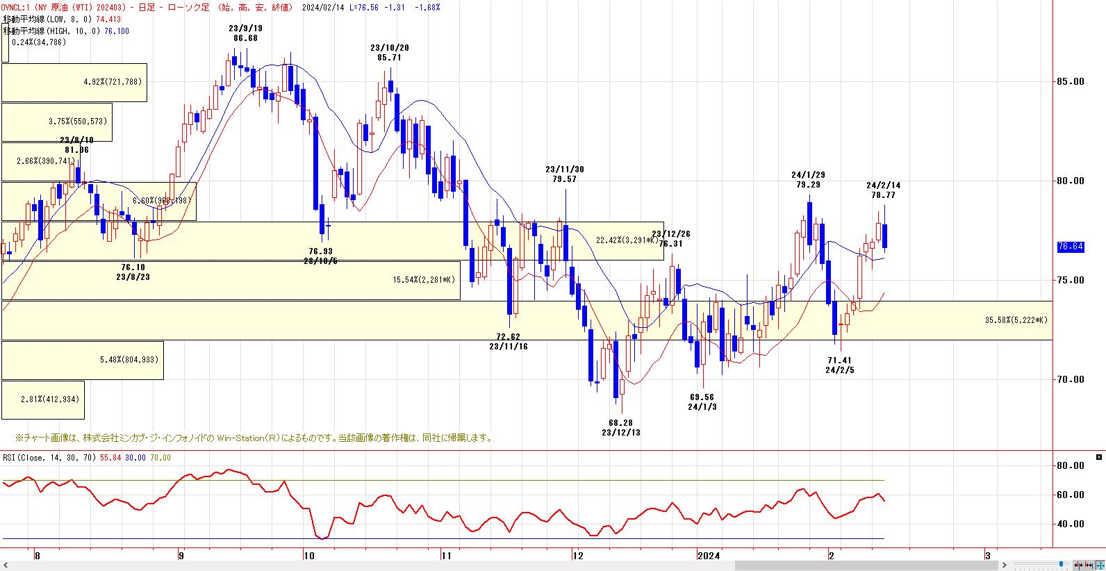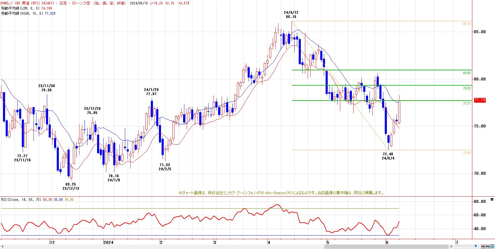 4月高値〜6月安値までの下げ幅に対する38.2%戻し達成。半値戻しは79.32ドル、61.8%戻しは80.93ドル。