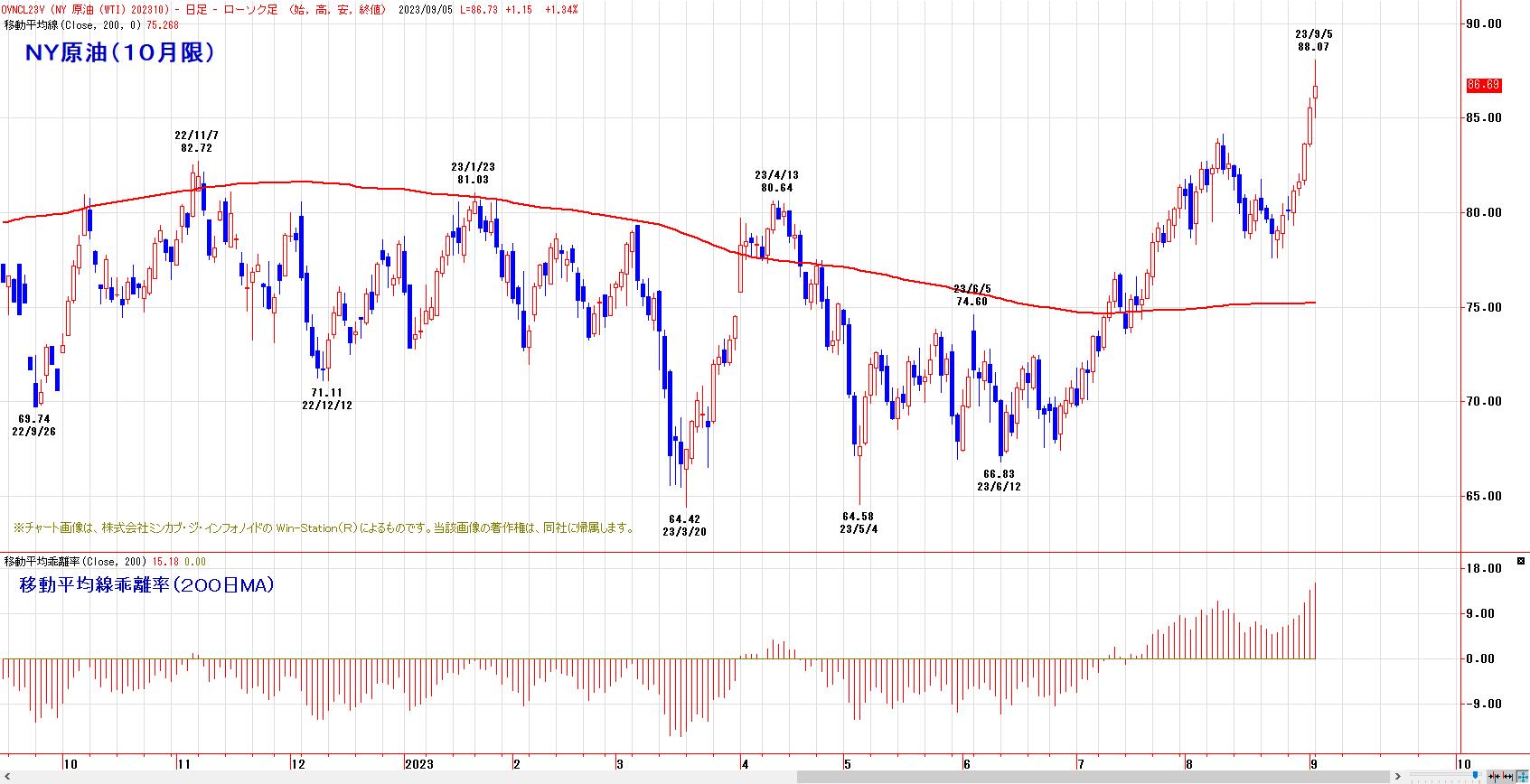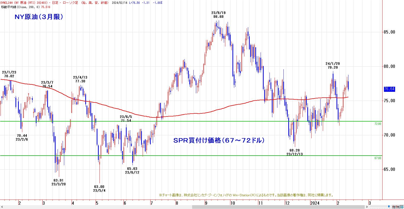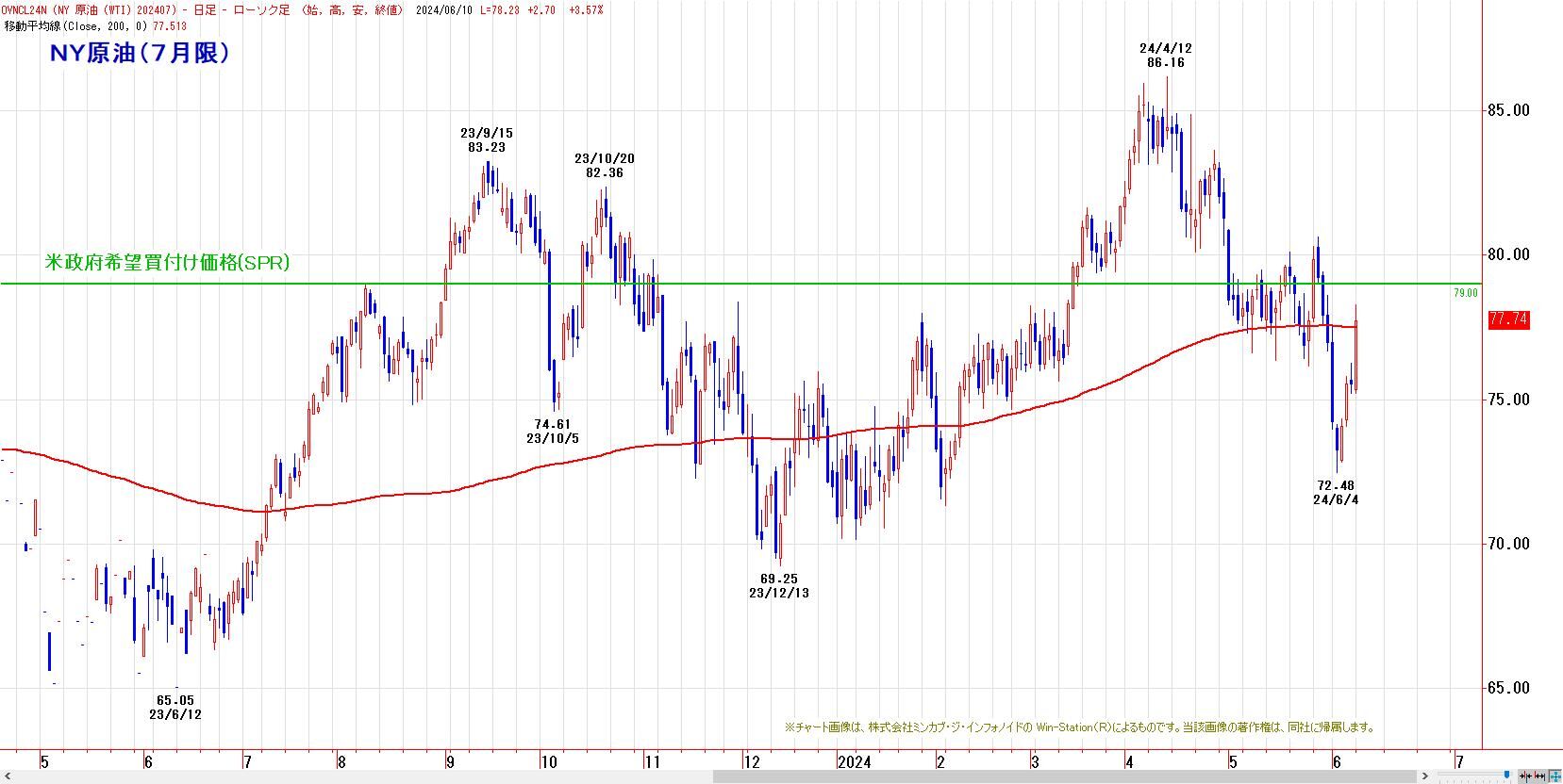 200日移動平均線を回復。79ドル以下水準は、米戦略備蓄積み増し期待が高まり、買われやすい。米ドライブシーズン・ハリケーンシーズンに入り、安値売込みはし難い時間帯。上値リスクは中東の地政学リスク。