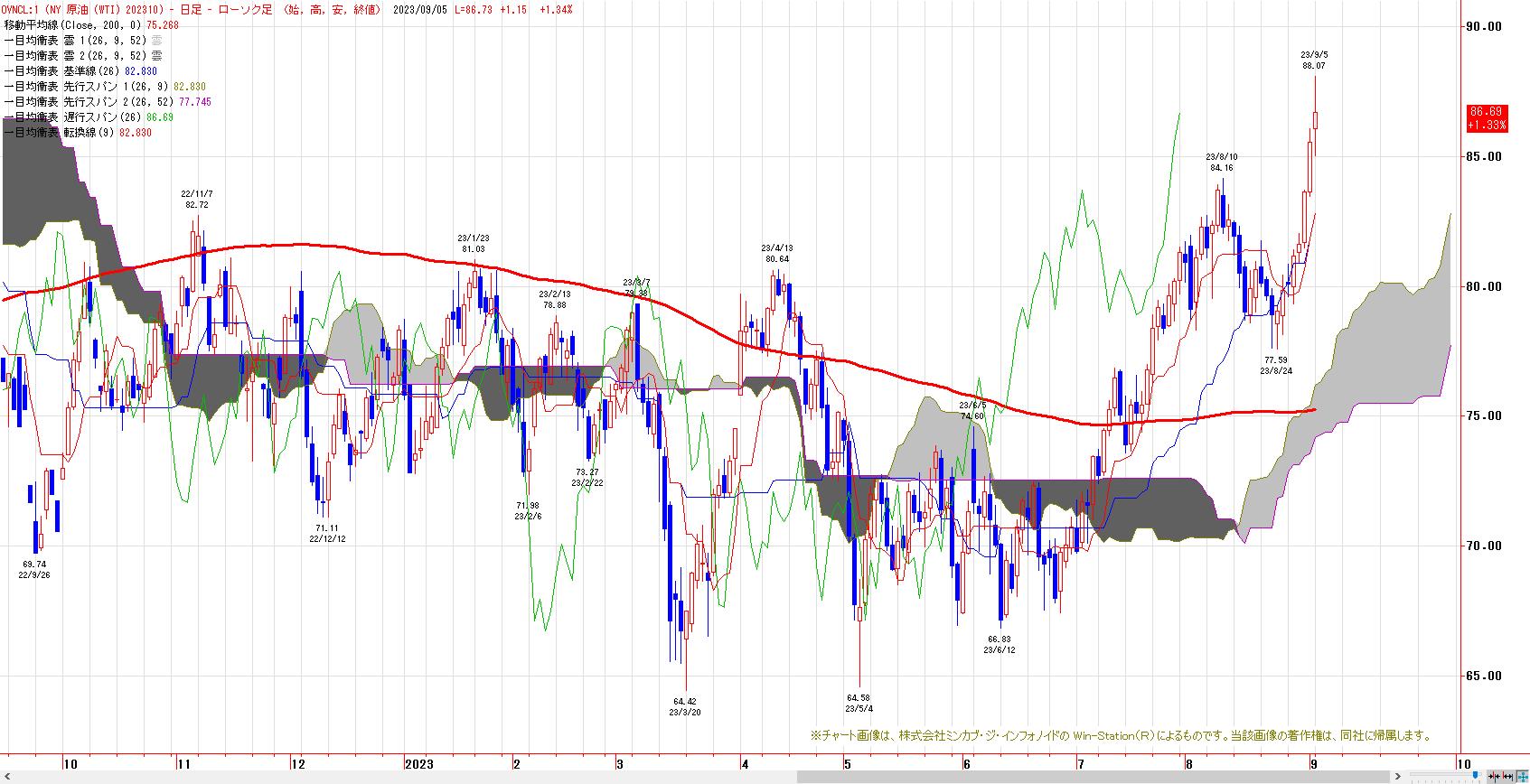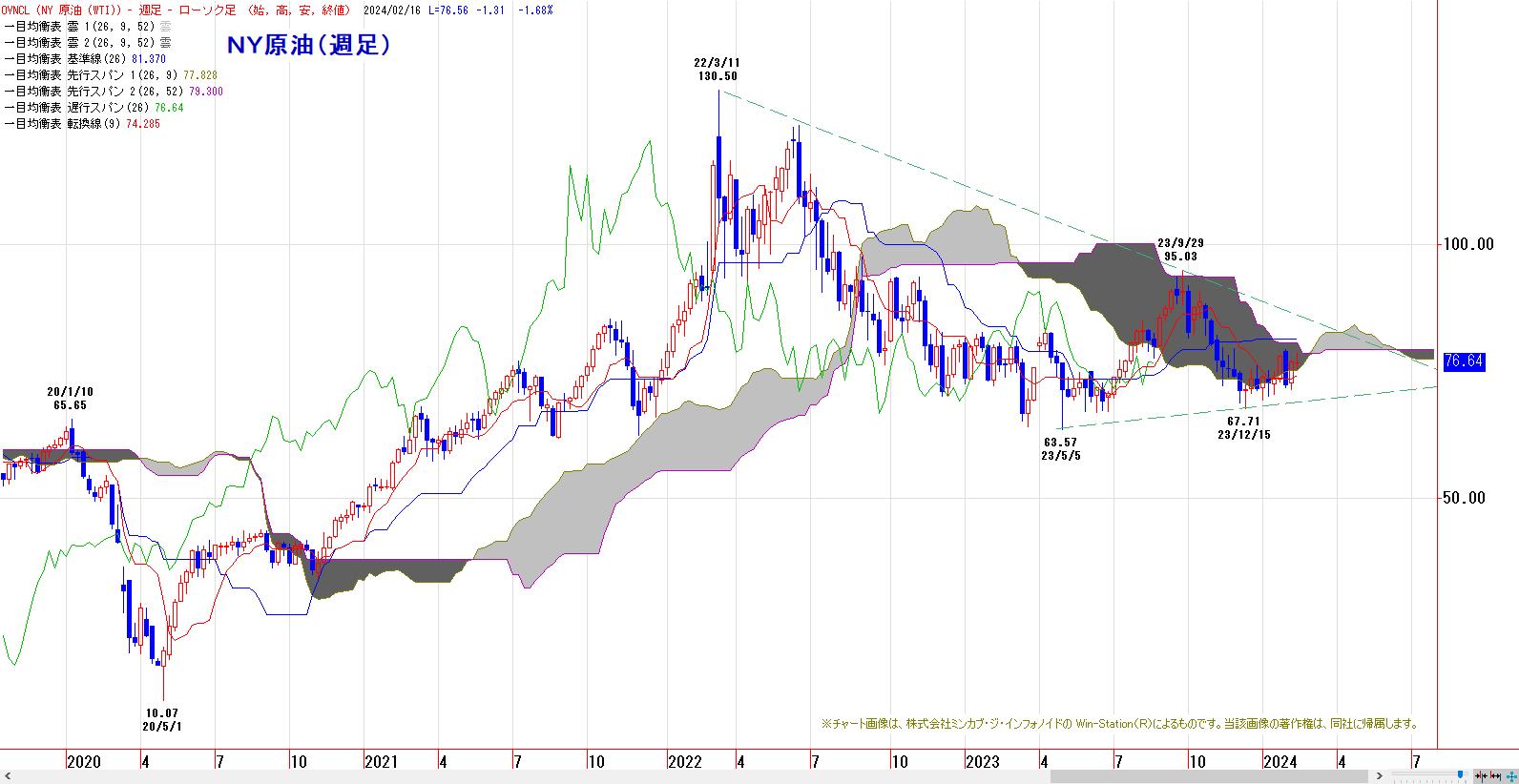 基準線〜転換線を上抜き、上げ加速。4月高値を起点とした下降チャネル上限の攻防戦へ。雲の下限が80ドル水準に位置する。雲のねじれも6月中旬以降に控える。
